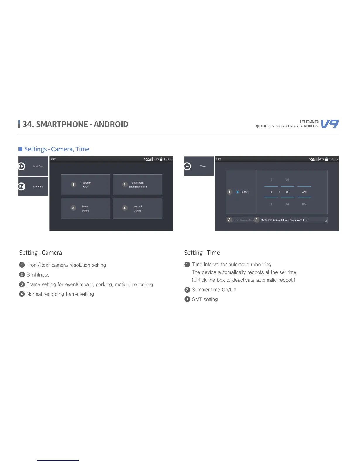 IROAD V9 - Android App - Camera and Time Settings; Camera and Time Settings via App