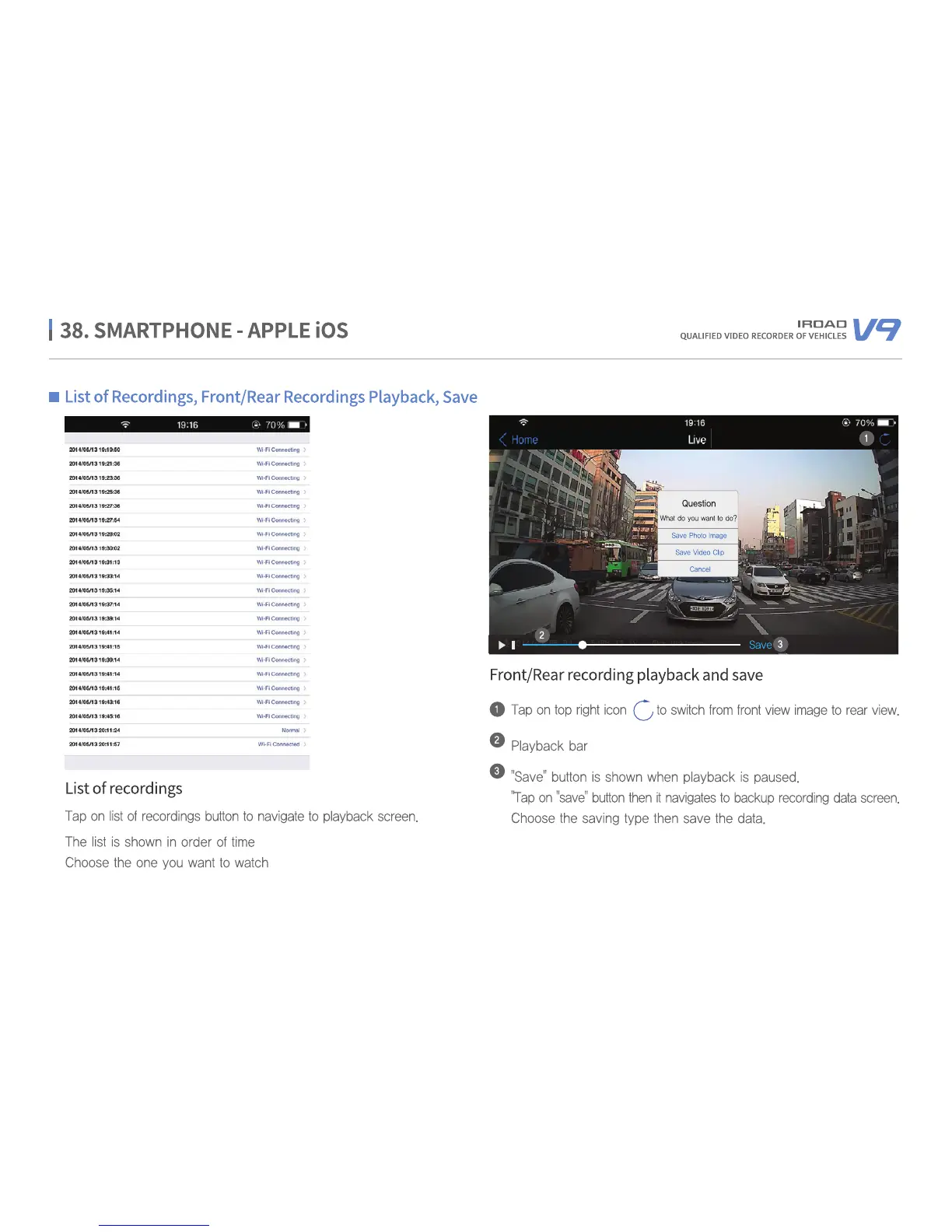 IROAD V9 - iOS App - Recording Management; Recording List and Playback (iOS); Saving Recordings on iOS Device