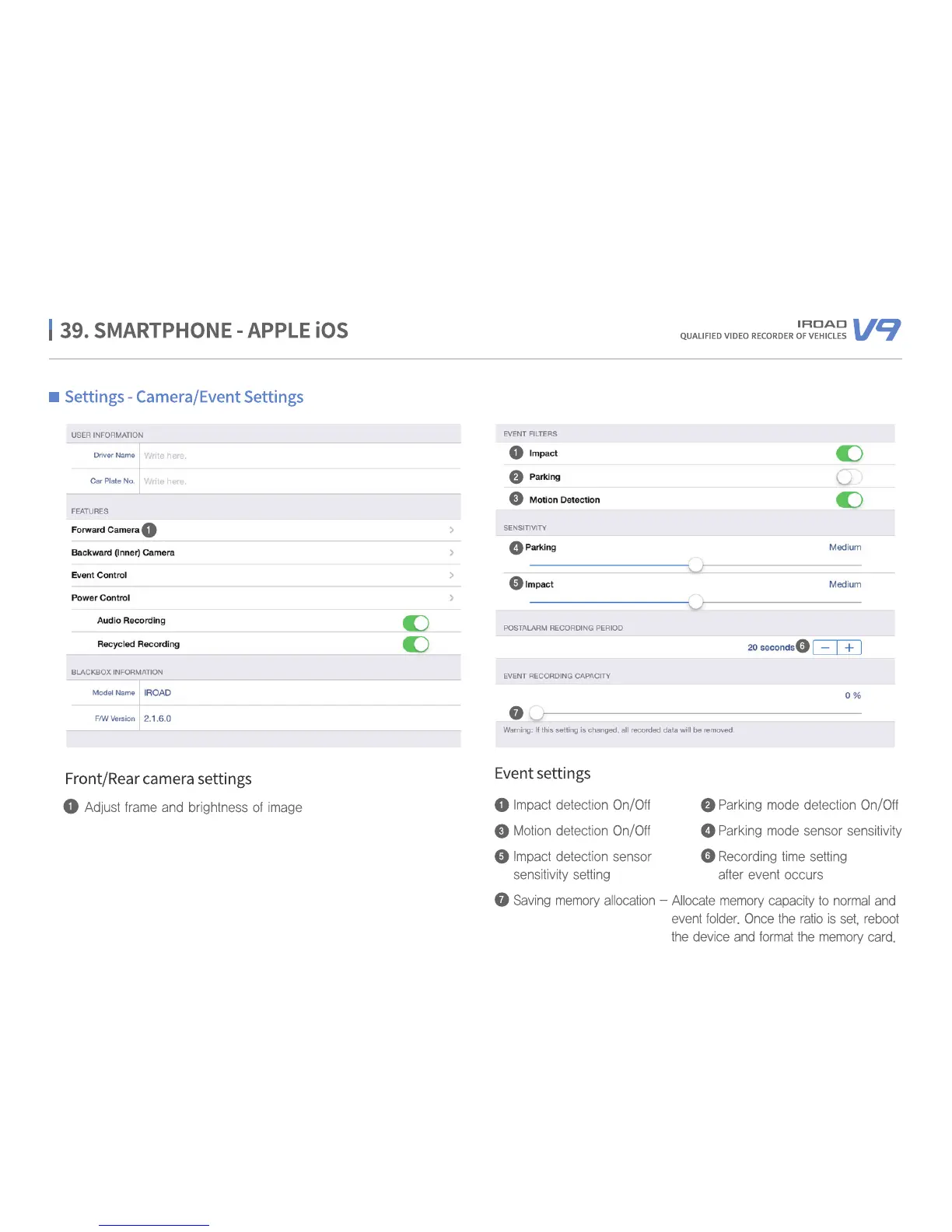 IROAD V9 - iOS App - Settings Configuration; Camera and Event Settings (iOS)