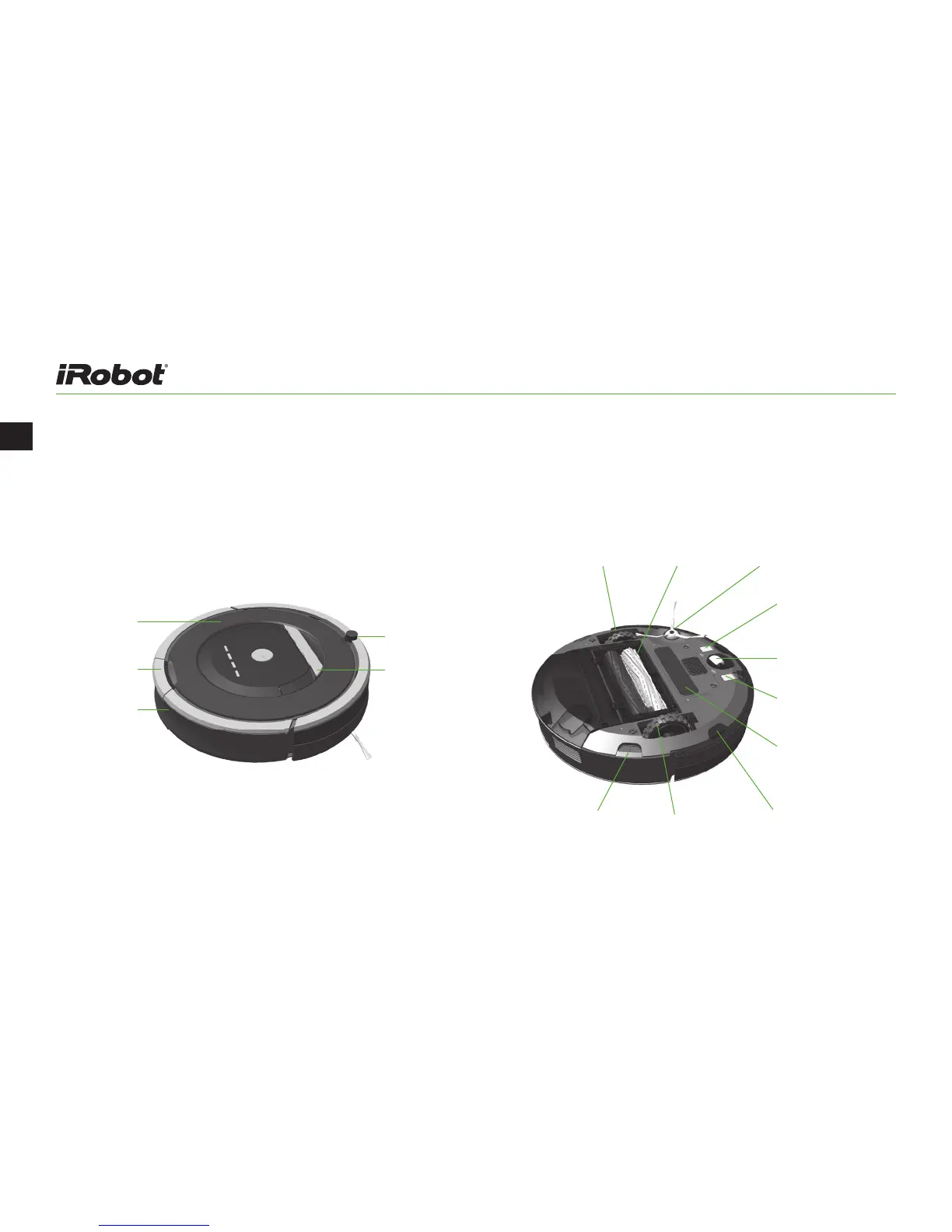 iRobot Roomba 800 - Robot Anatomy Overview; Top View Components; Bottom View Components