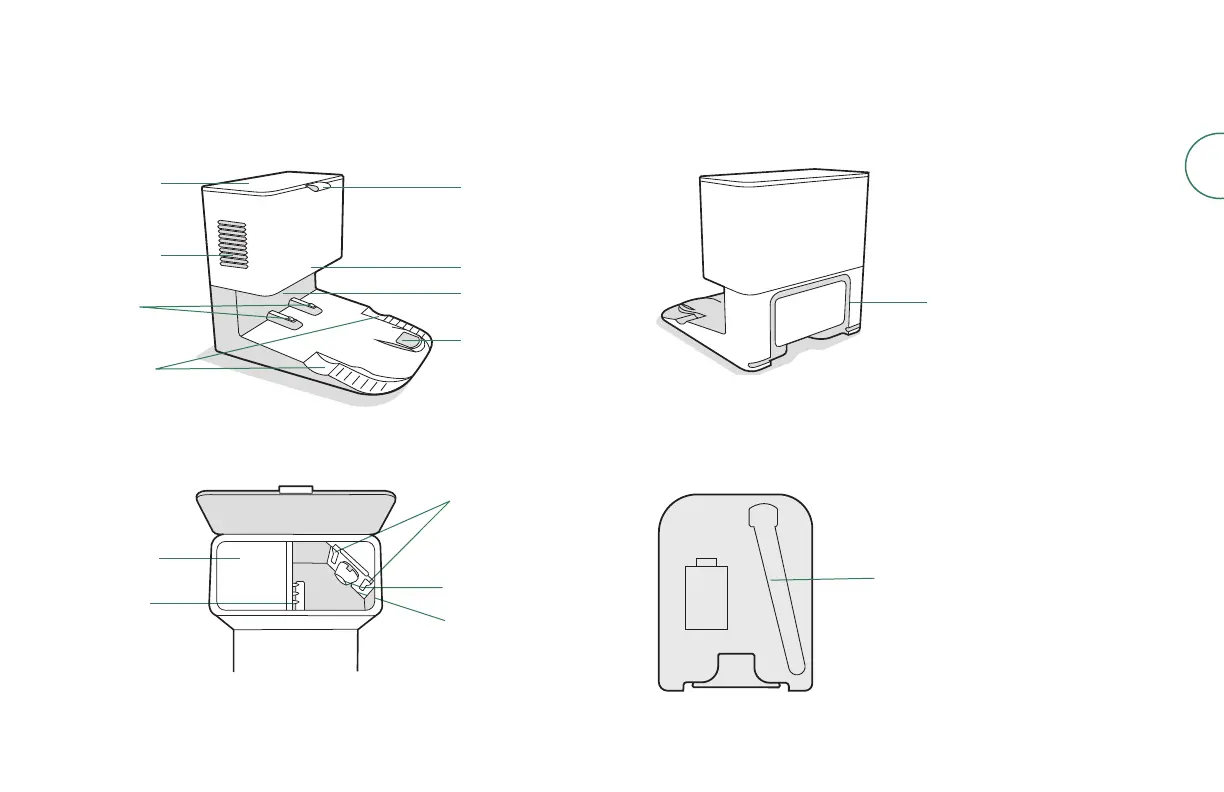 iRobot Roomba Combo j7+ - Clean Base Component Identification: Views; Clean Base Views: Front, Back, Top, and Bottom