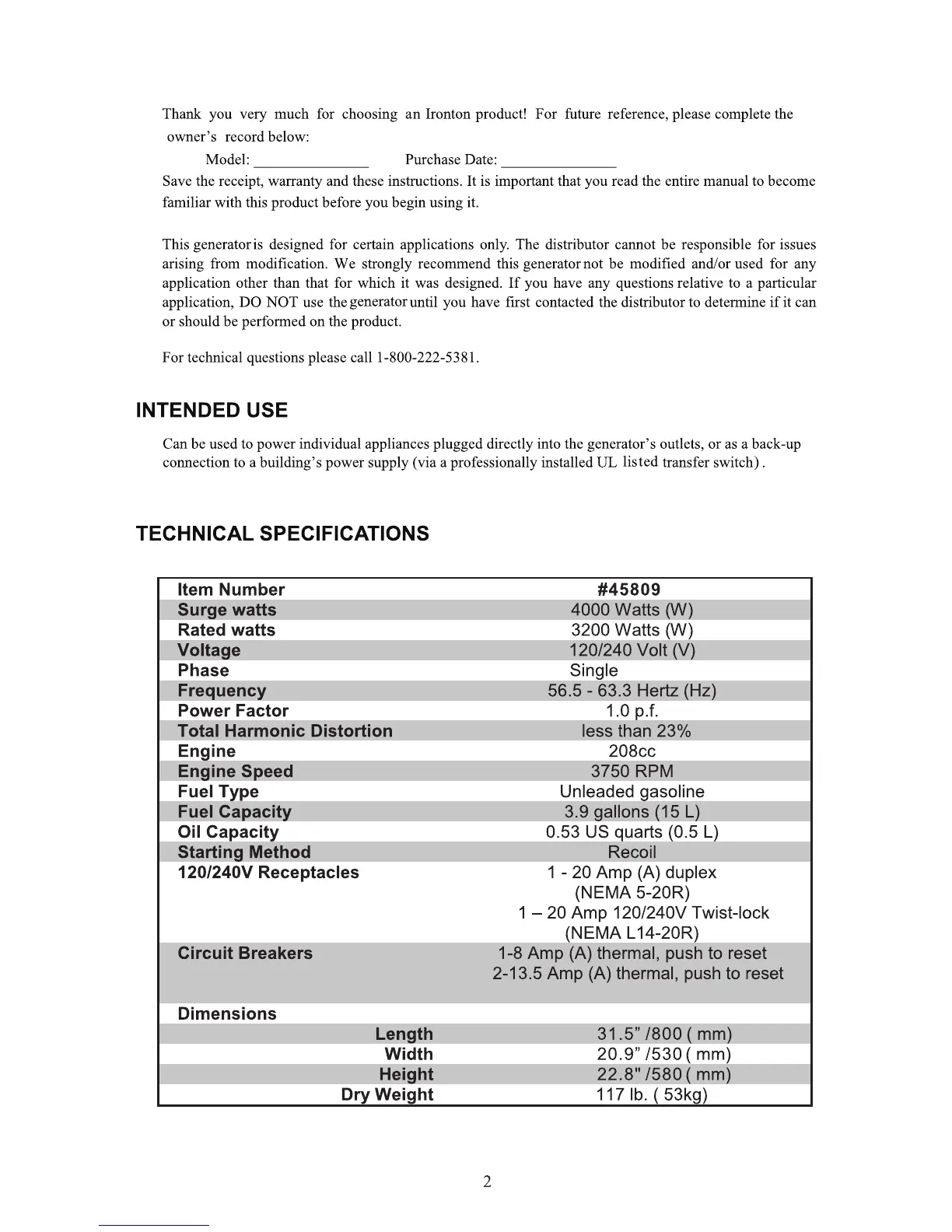Ironton 45809 - INTENDED USE; TECHNICAL SPECIFICATIONS