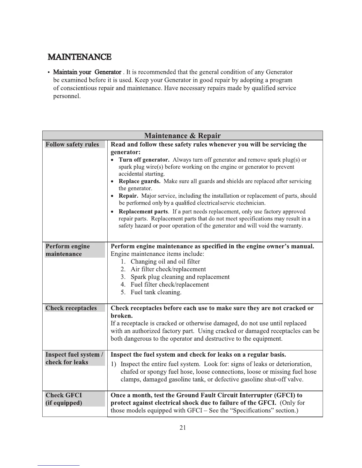 Ironton 45809 - MAINTENANCE; Follow safety rules; Perform engine maintenance; Check receptacles
