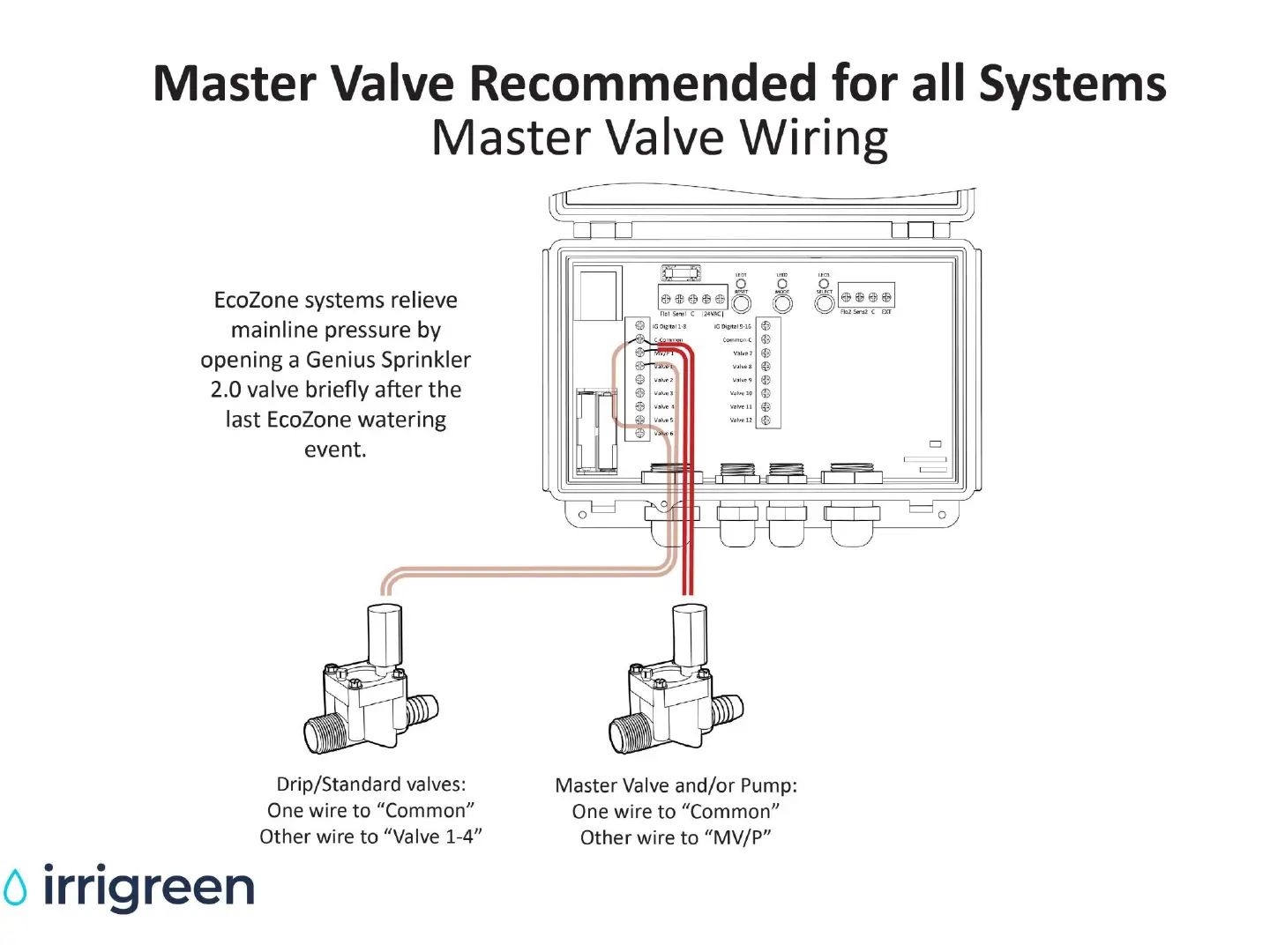IrriGreen 2 - Master Valve Wiring Recommendation; System Pressure Relief; Master Valve Connections