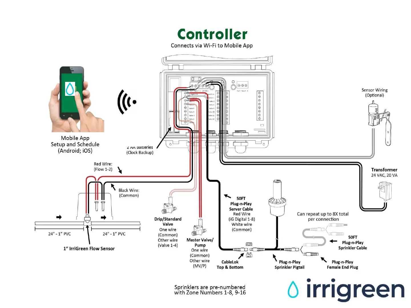 IrriGreen Irrigreen2 - System Wiring Guide; Controller Wiring Overview; Flow Sensor Wiring; Sprinkler and Valve Wiring