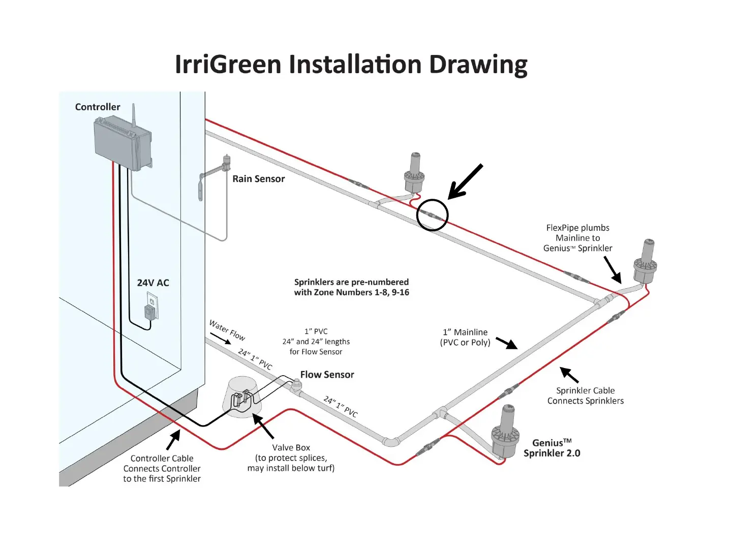 IrriGreen Irrigreen2 - IrriGreen Installation Diagram; Controller and Sensor Connections; Sprinkler and Mainline Layout