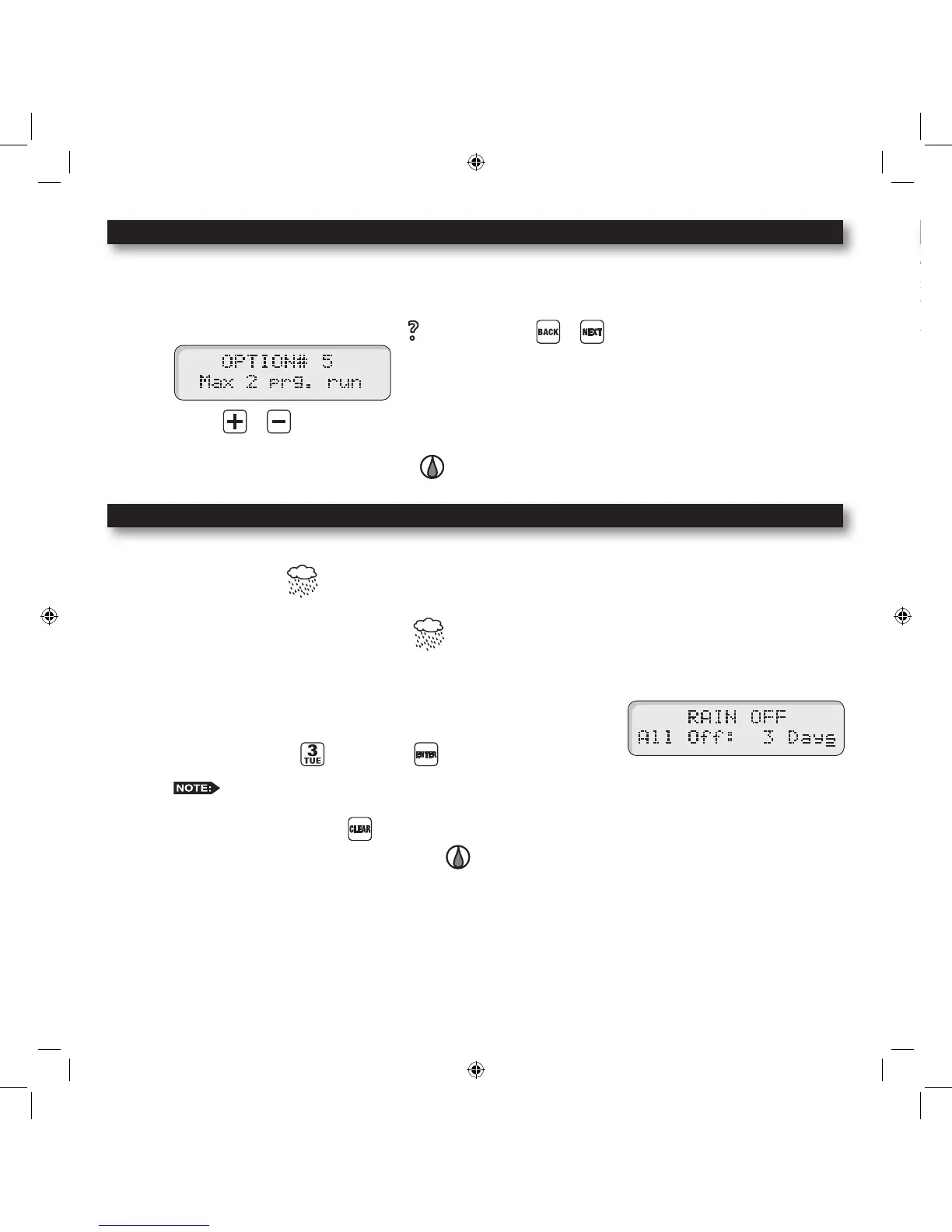 automatic watering cycles are halted until the Rain Off duration has elapsed. Programs can be indenitely turned off when