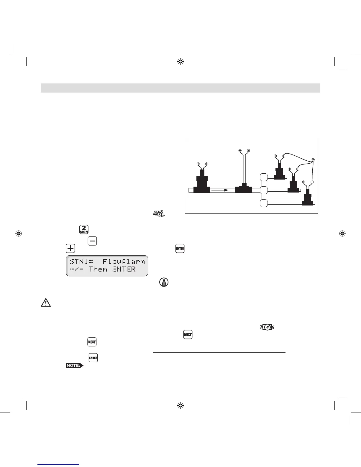 The ow alarm can be used to activate a normally open master valve which is installed ahead of the other valves on the system.