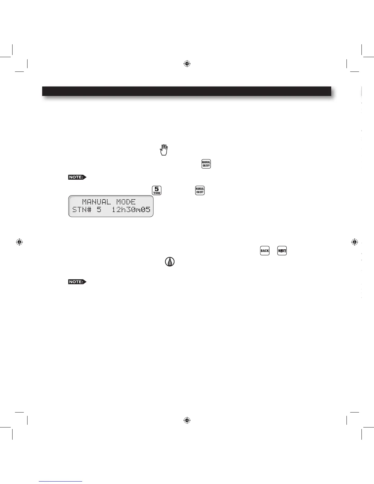 station will then water until you turn it off or until the controller’s current time reaches midnight. As a safety precaution,
