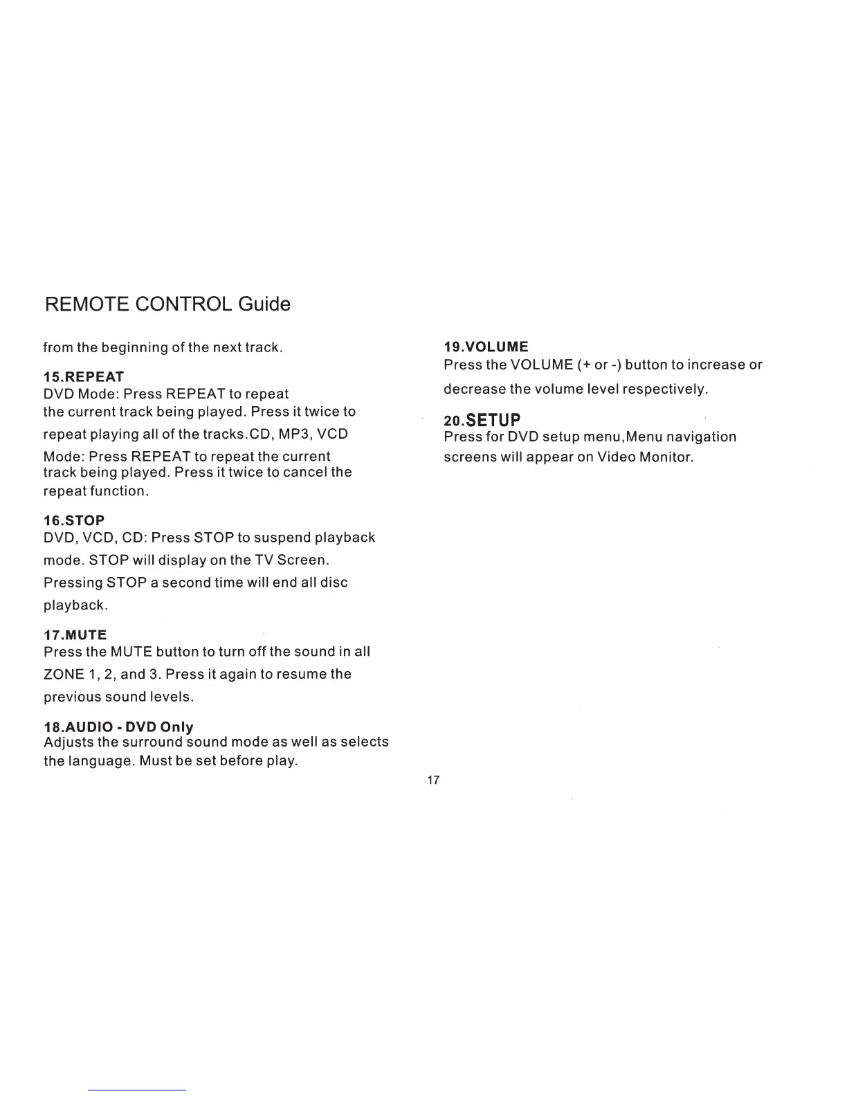 iRV Technologies iRV 34 - Advanced Remote Functions; Repeat, Stop, and Mute Control; Audio, Volume, and Setup Menu