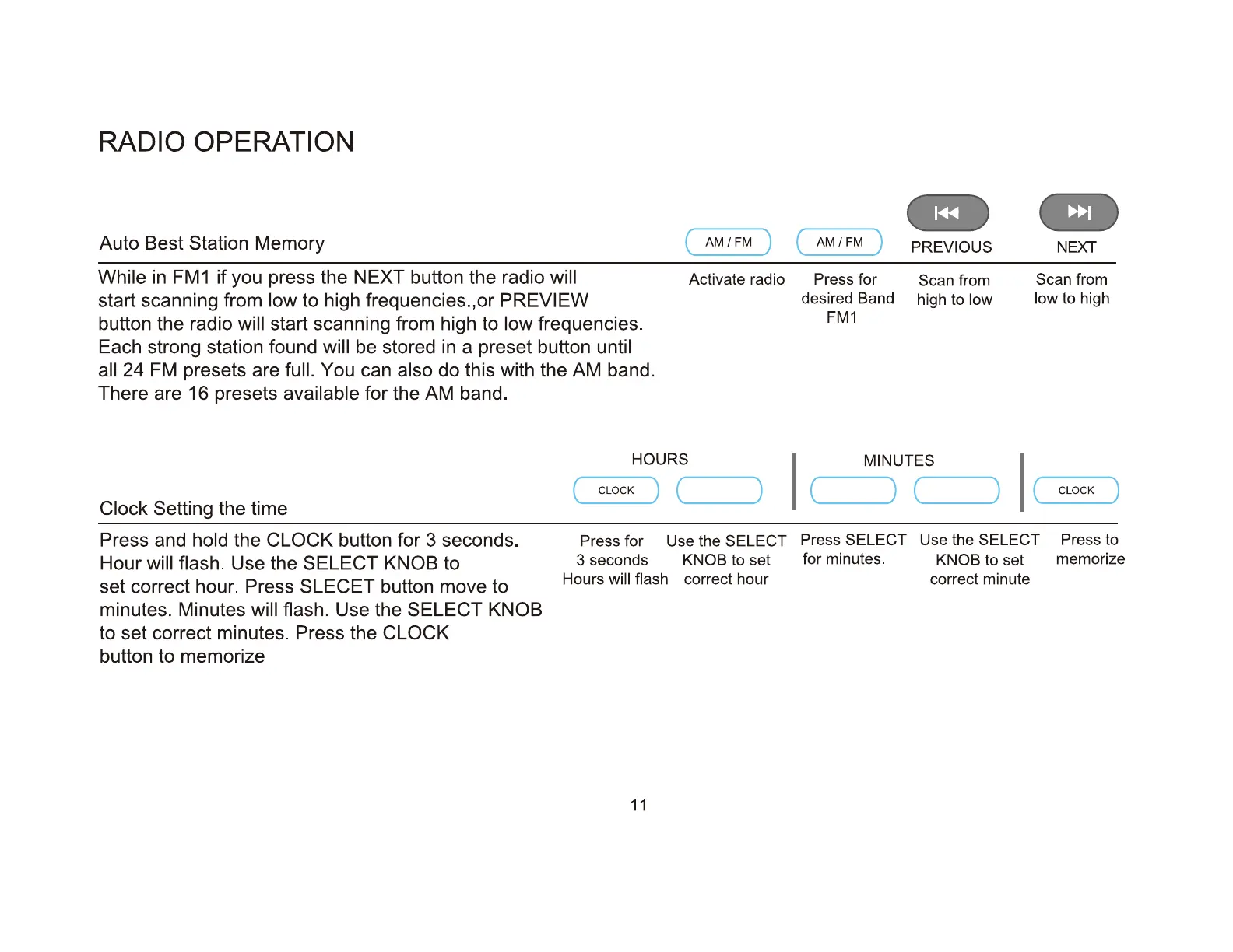 iRV Technologies iRV66 - Radio and Clock Setup; Station Memory and Scanning; Clock Setting Procedure