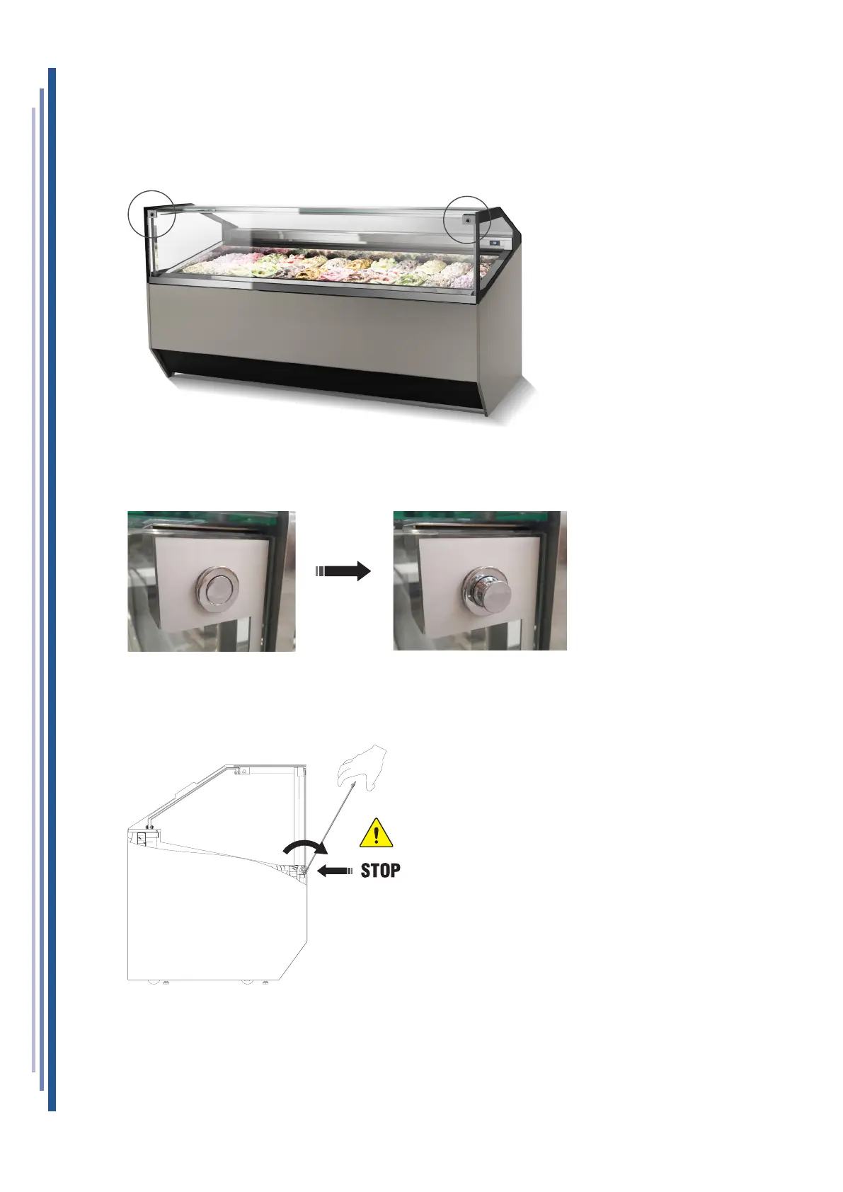 The front glass has opening limited by means of a limit switch; under no circumstances force the opening beyond the