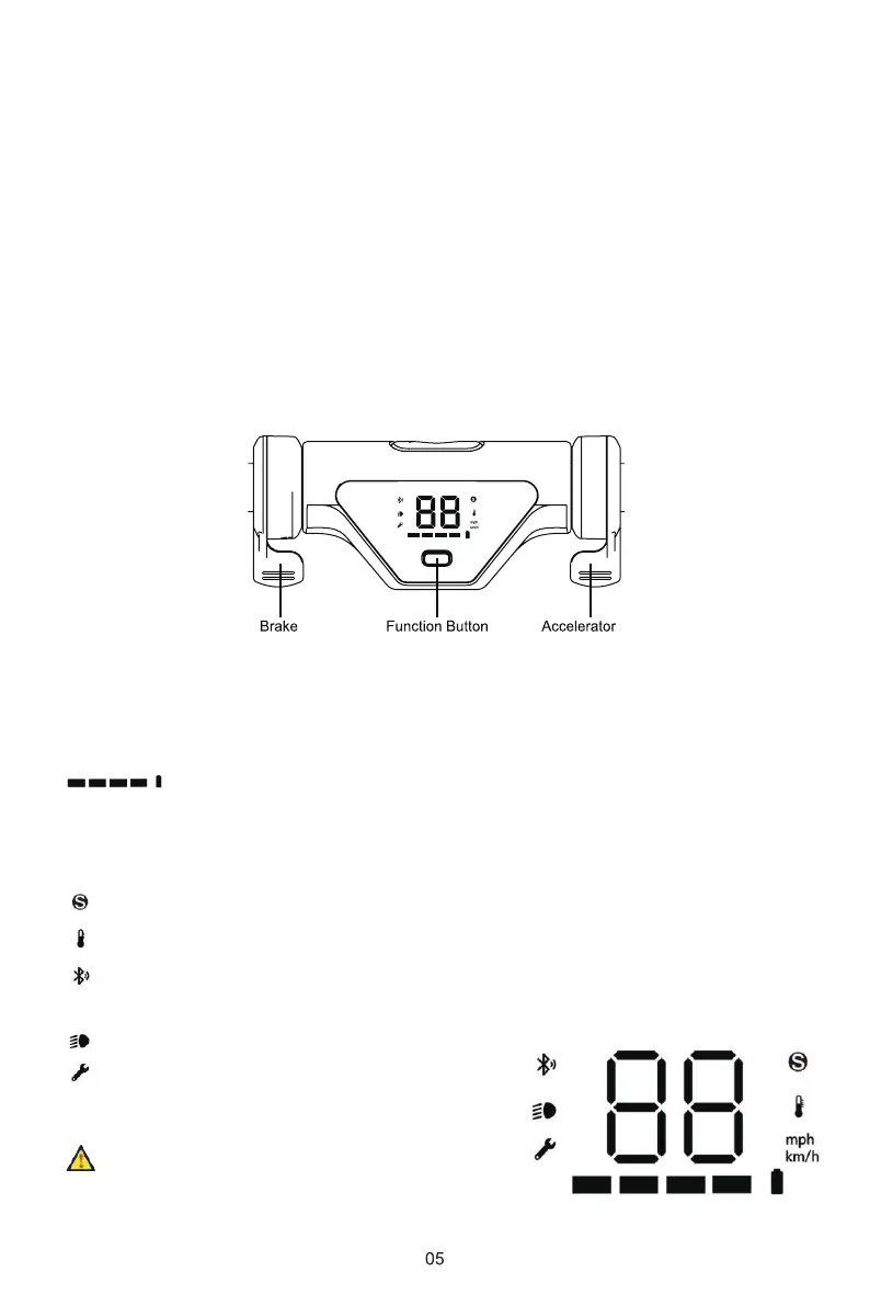 Power : Press and hold for 3~5 seconds to turn on/off the scooter.
