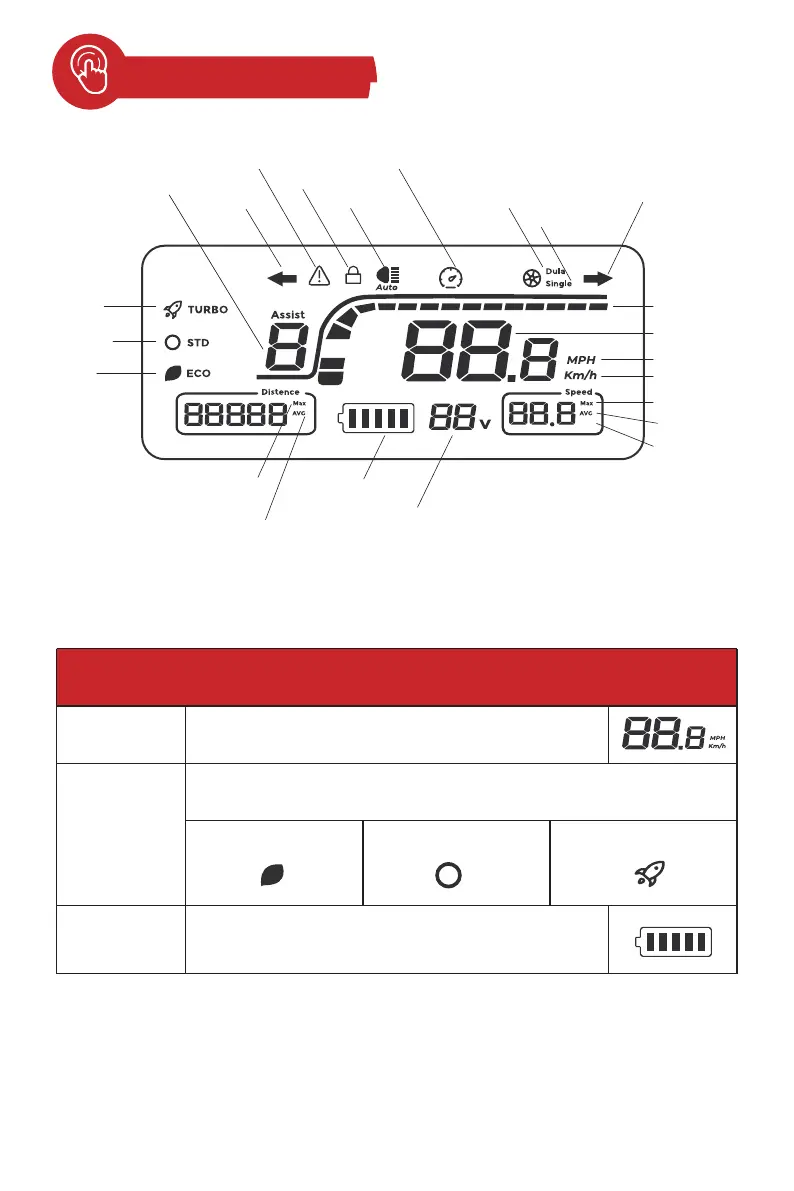 Three riding modesafter power on, press +/- key to switch between ECO,
