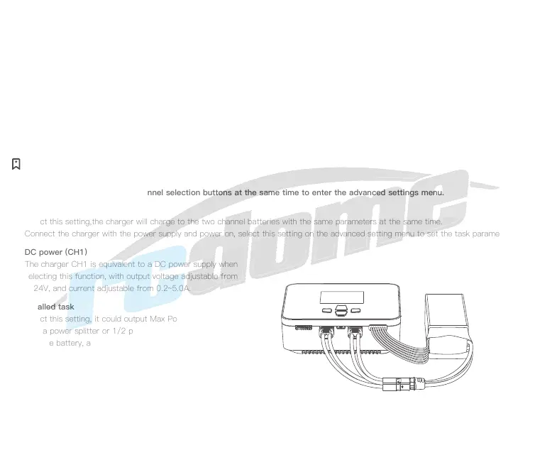 Select this setting,the charger will charge to the two channel batteries with the same parameters at the same time.