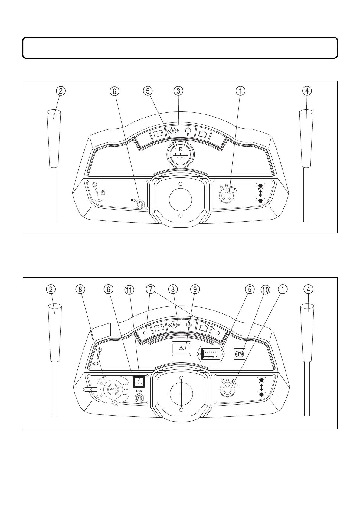 (2) Throttle lever (5) Hourmeter (8) Combination switch (11) High beam lamp