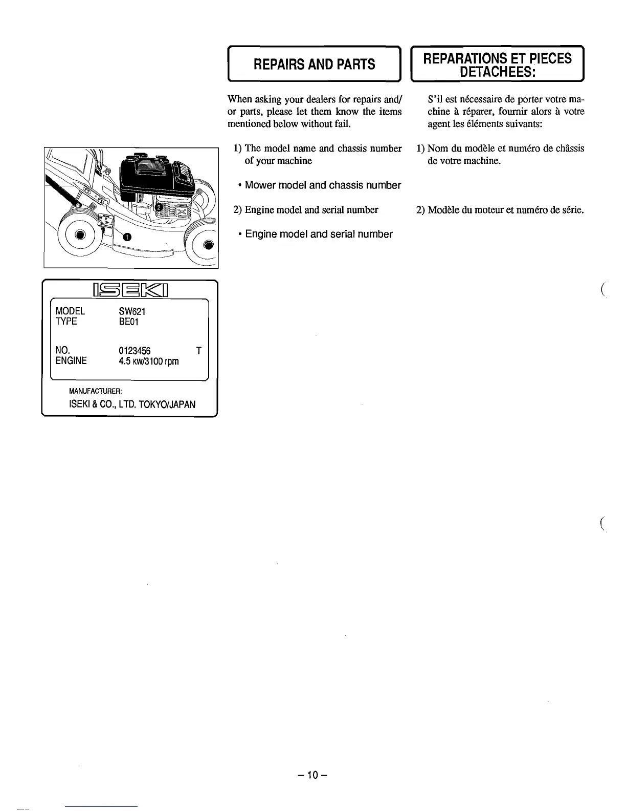 2) Modele du moteur et numero de serie.