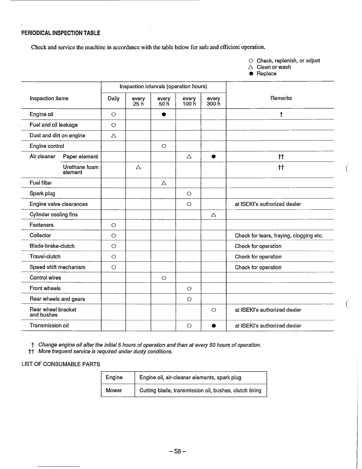 Check and service the machine in accordance with the table below for safe and efficient operation.