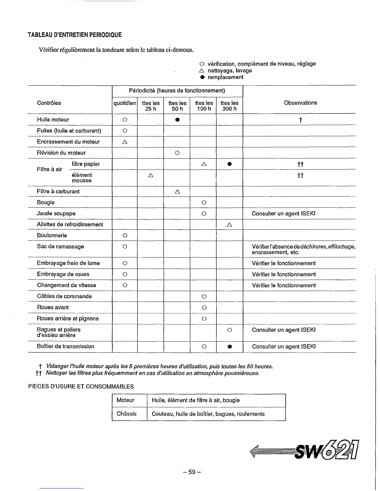 t Vidanger /'huile moteur epres les 5 premieres heures d'utilisation, puis toutes les 50 heures.