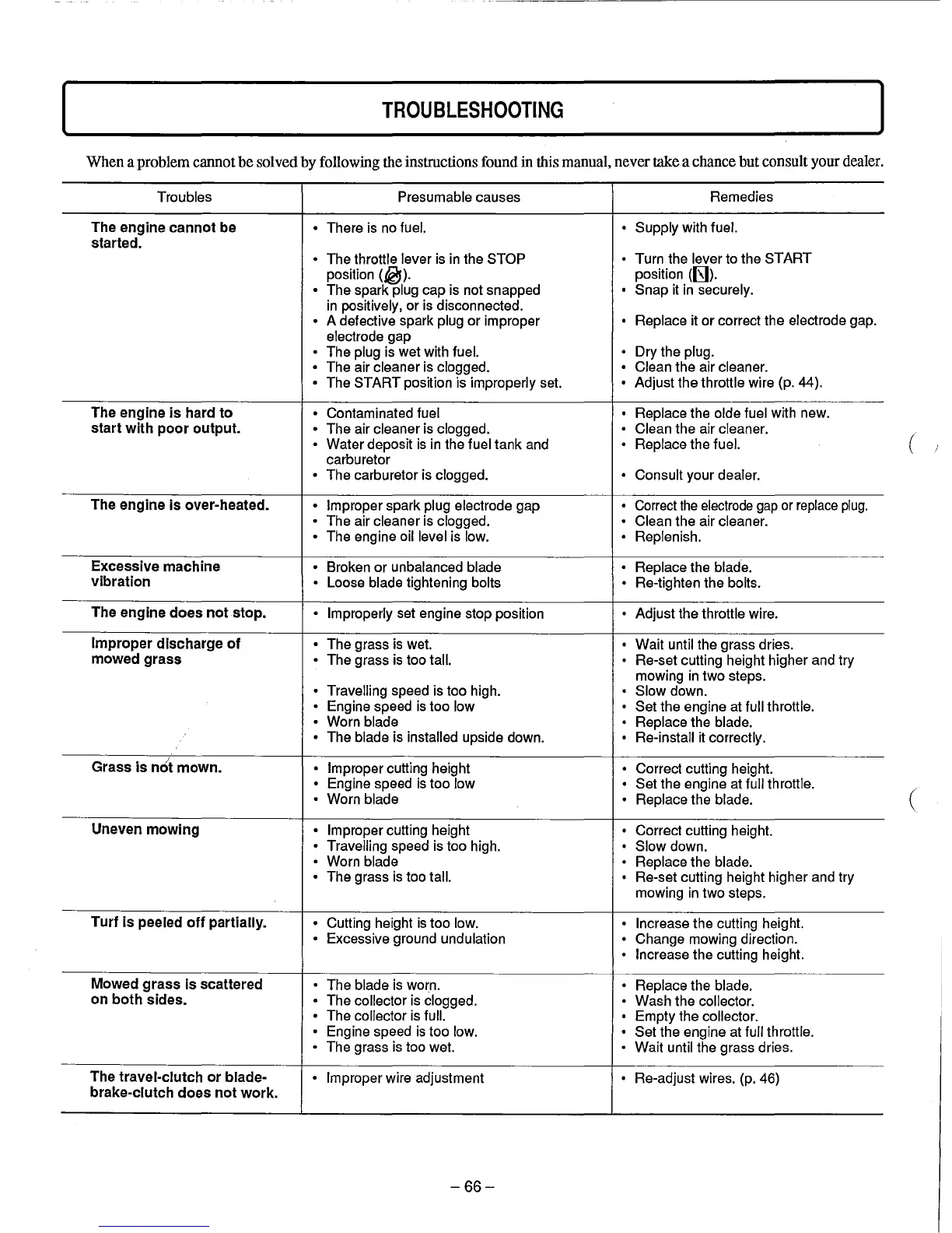 o The START position is improperly set. o Adjust the throttle wire (p. 44).
