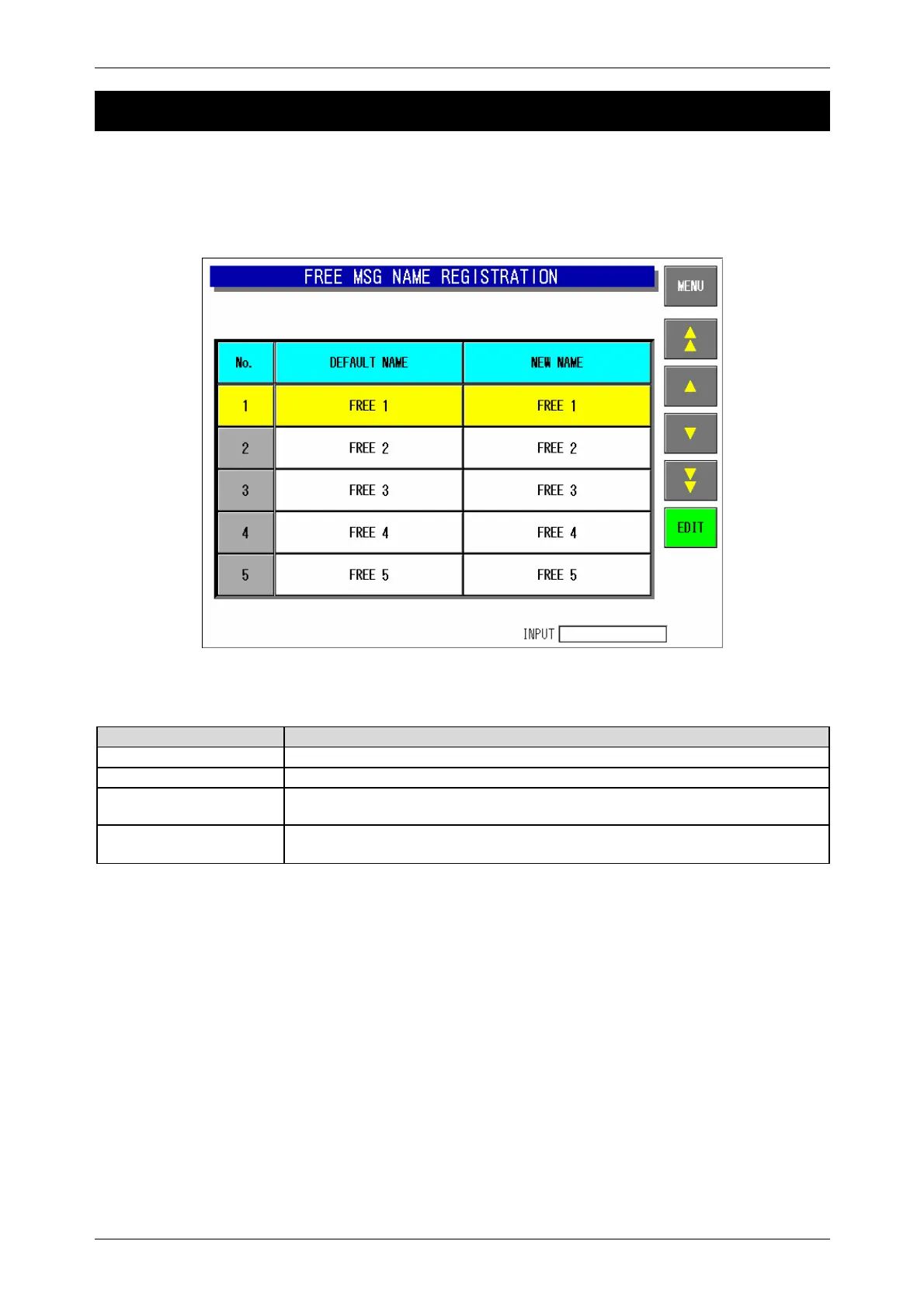 On this screen, there are five areas named Free 1 through Free 5 you can freely use. You can change