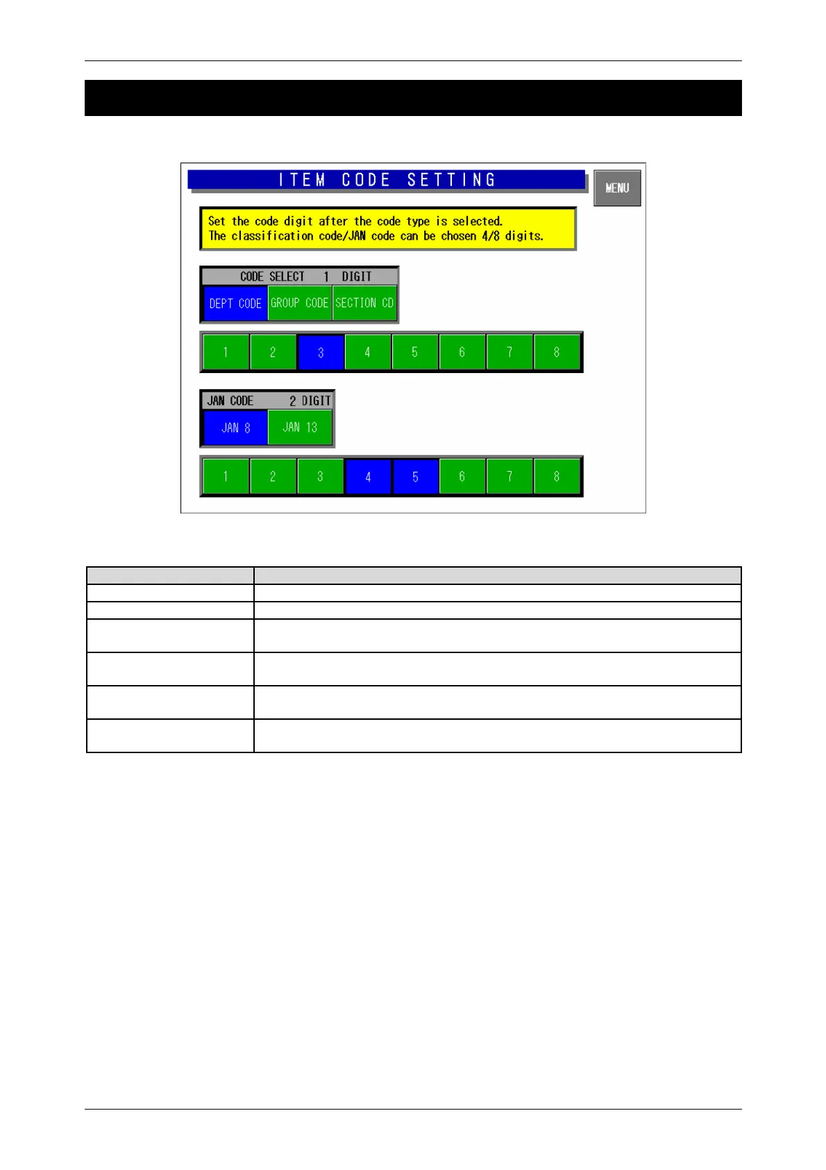 Item Code Setting Screen