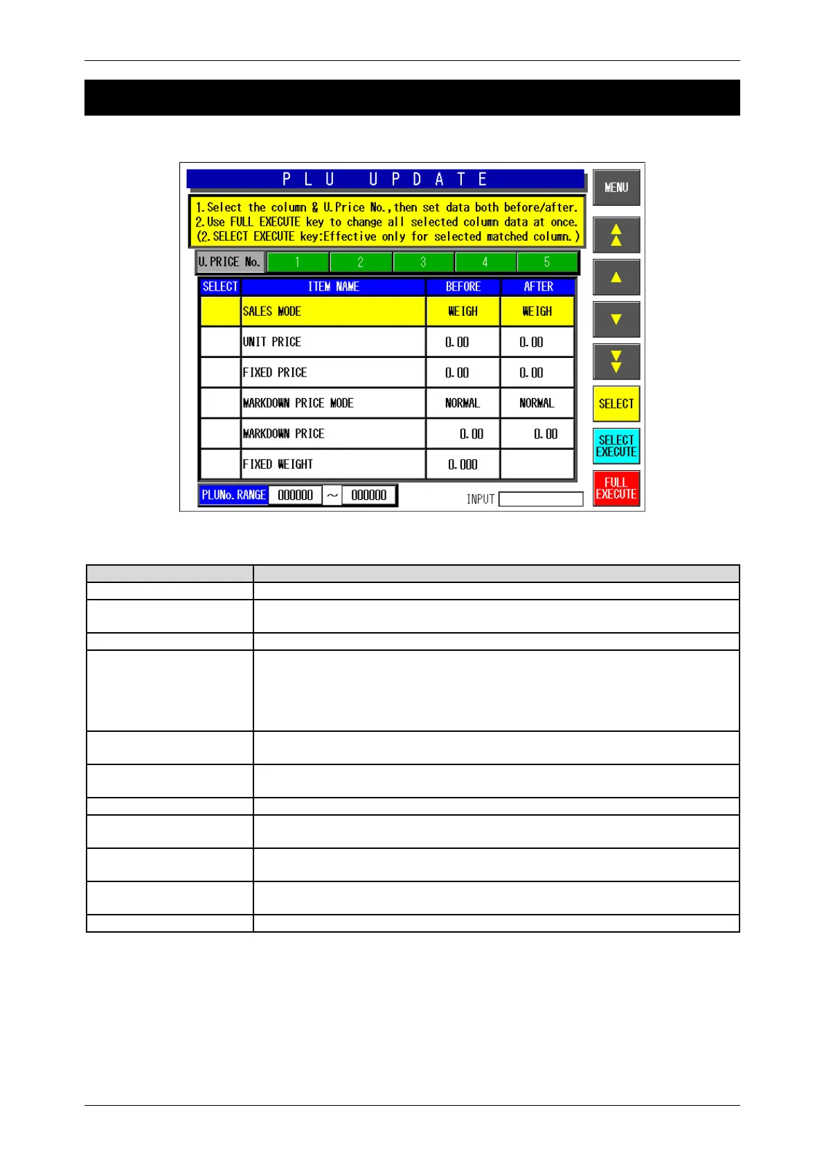 FULL EXECUTE Executes changes in “After” field for the selected items only to all PLU master