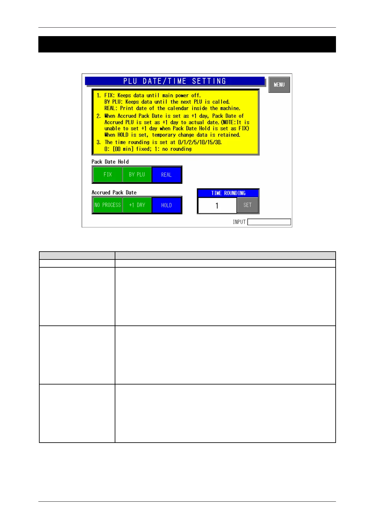 y By PLU: Pack date and time at the time of PLU call is held until next PLU is