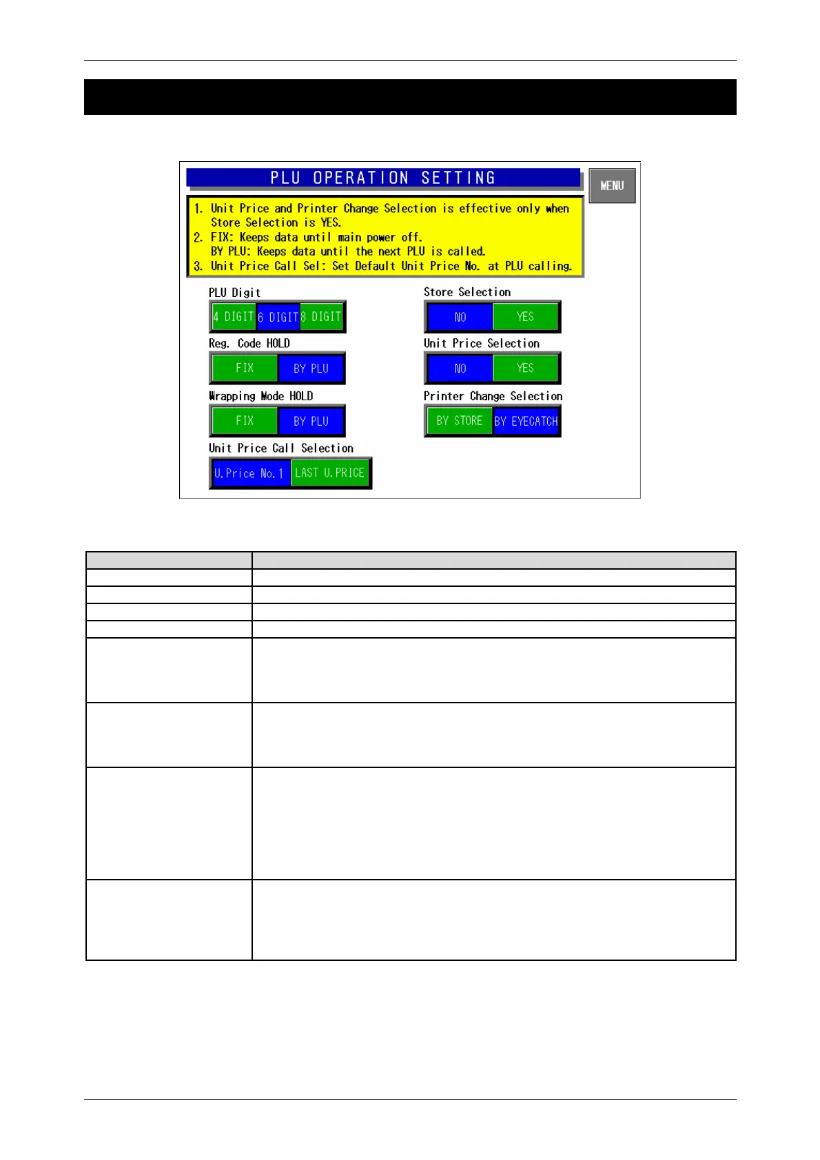 PLU Operation Setting Screen