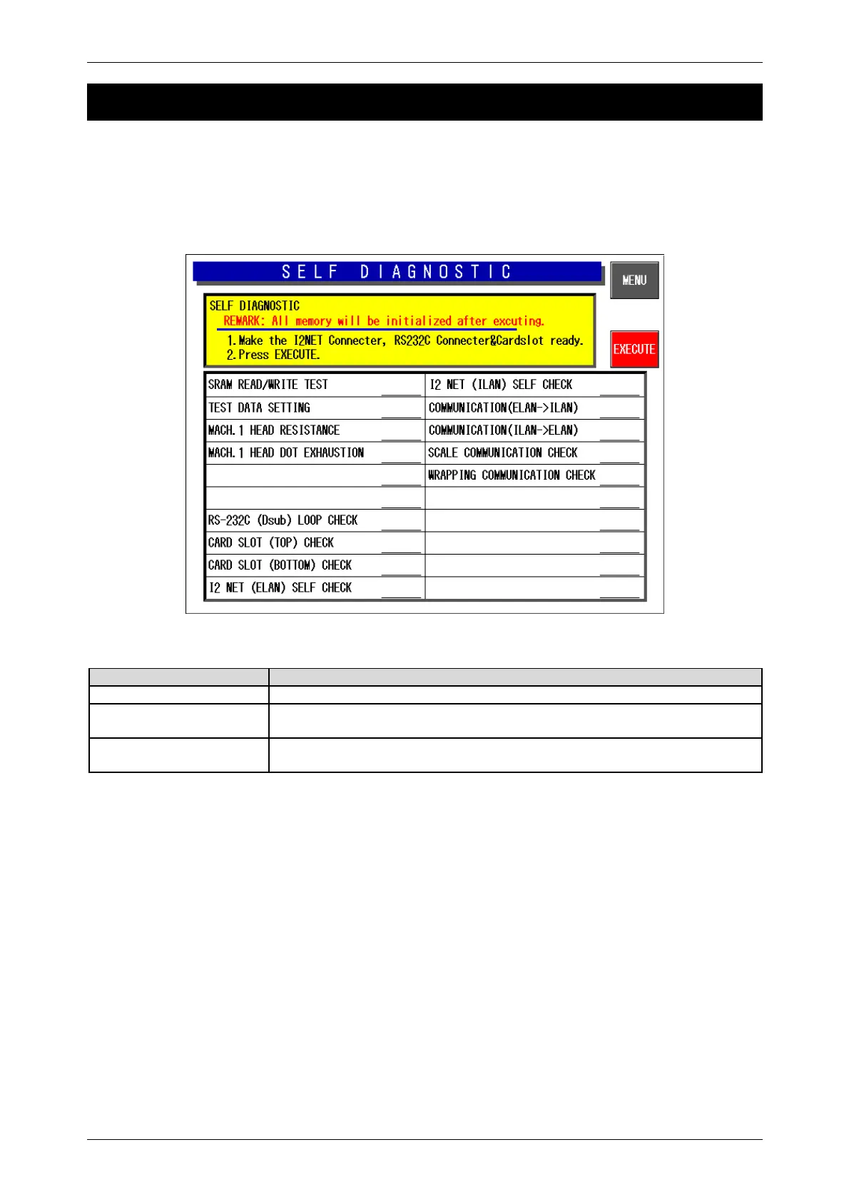 Press the [Self Diagnostic] button on the Test Menu screen. Then, the Self Diagnostic screen appears.