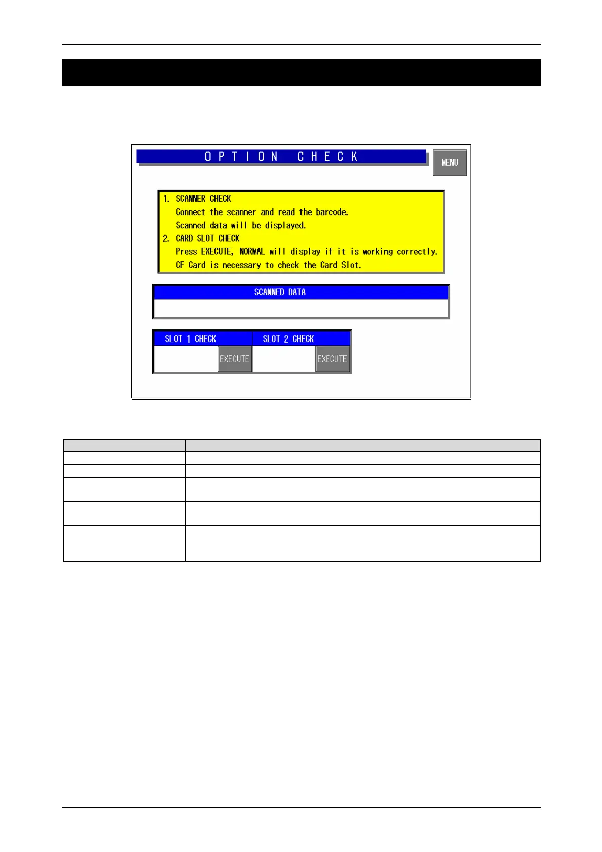 Press the [Option Check] button on the Test Menu screen. Then, the Option Check screen appears.