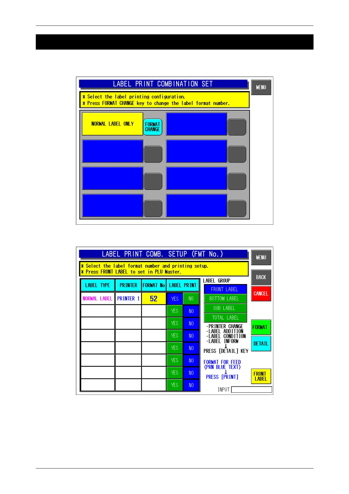 On this Label Print Combination Setup screen, select the label printing configuration, set various