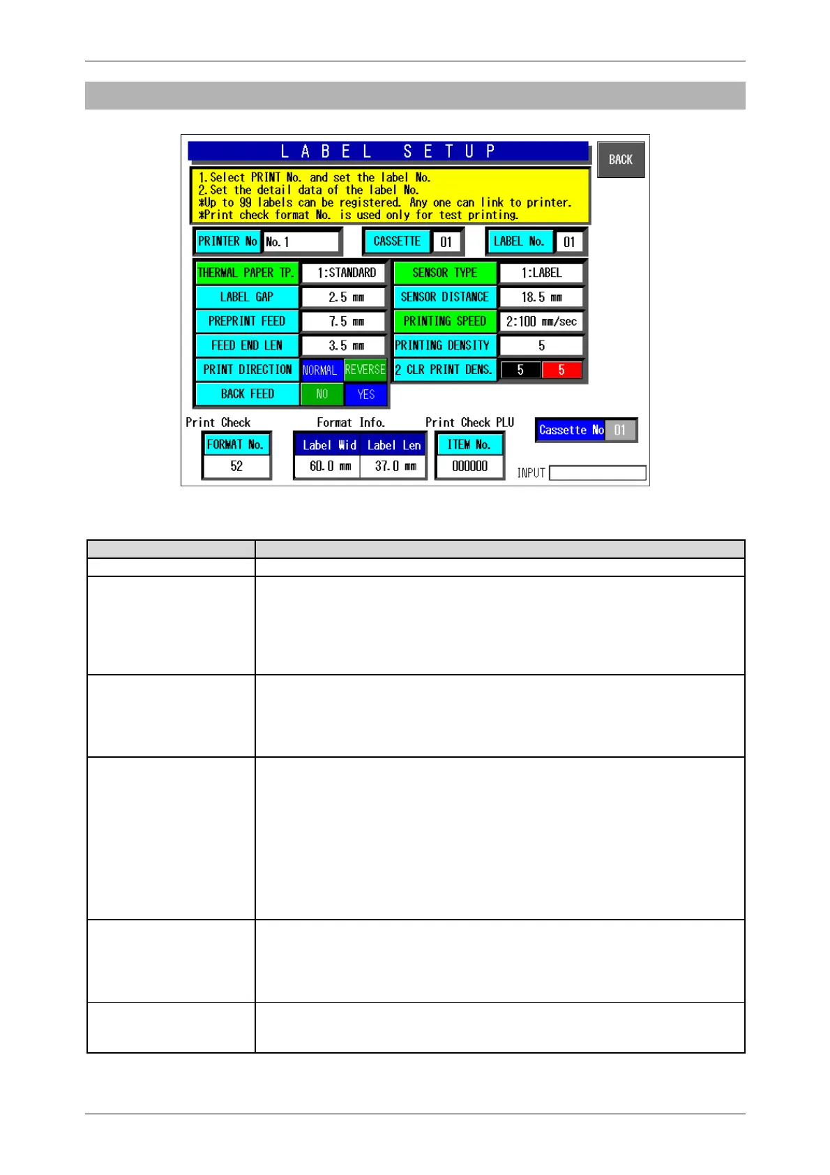 Printer No. Press after numeric entry to display the label information of the entered
