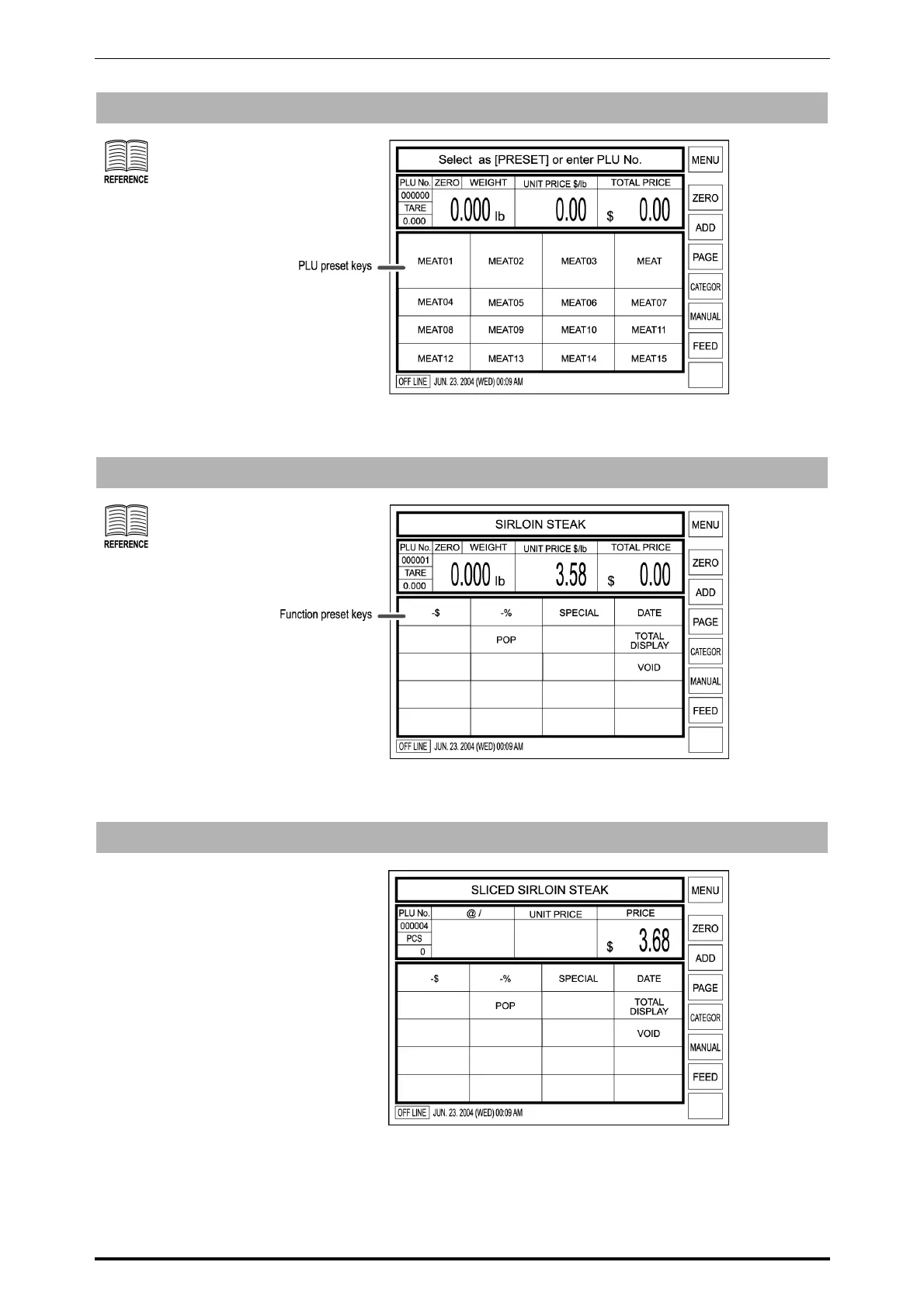 ISHIDA SR-2000 alpha - PLU Select Screen; Weighing Product Screen; Fixed Price Product Screen
