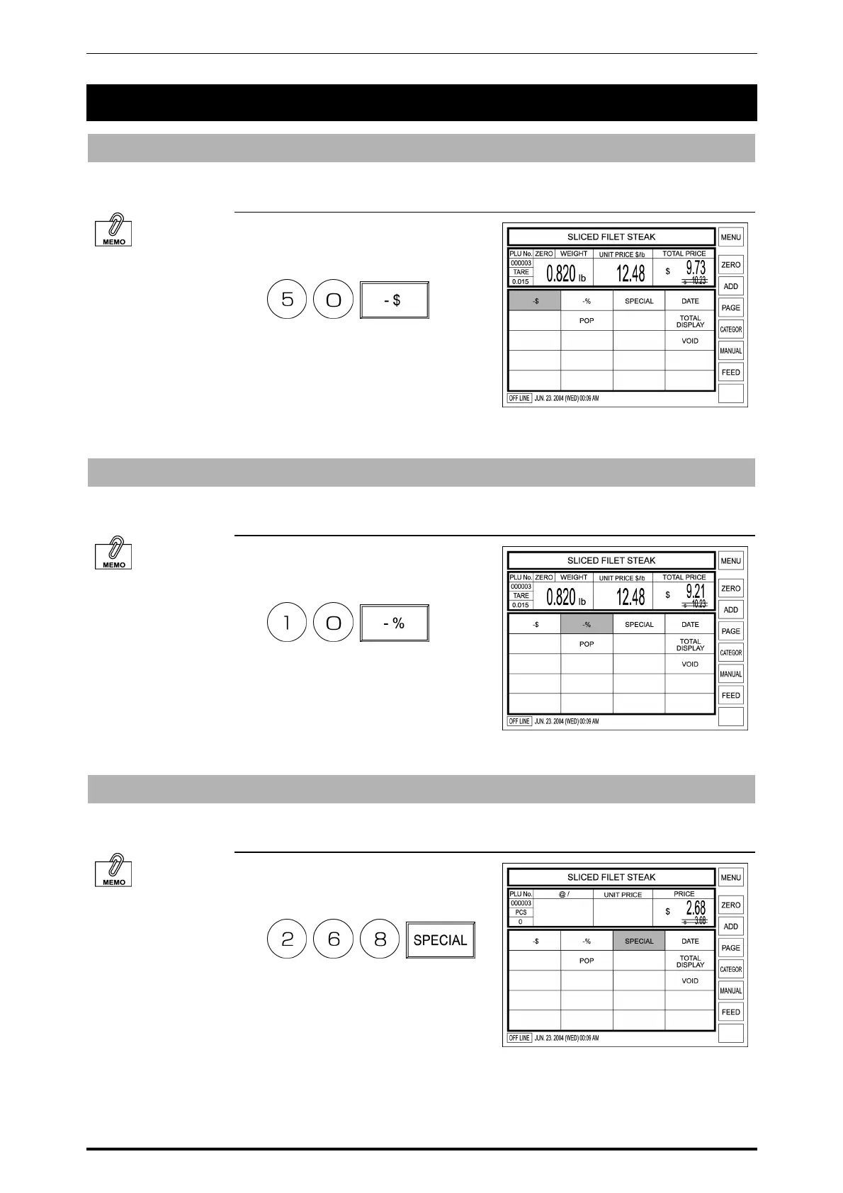 Selling price of the displayed PLU can be temporarily discounted by amount.