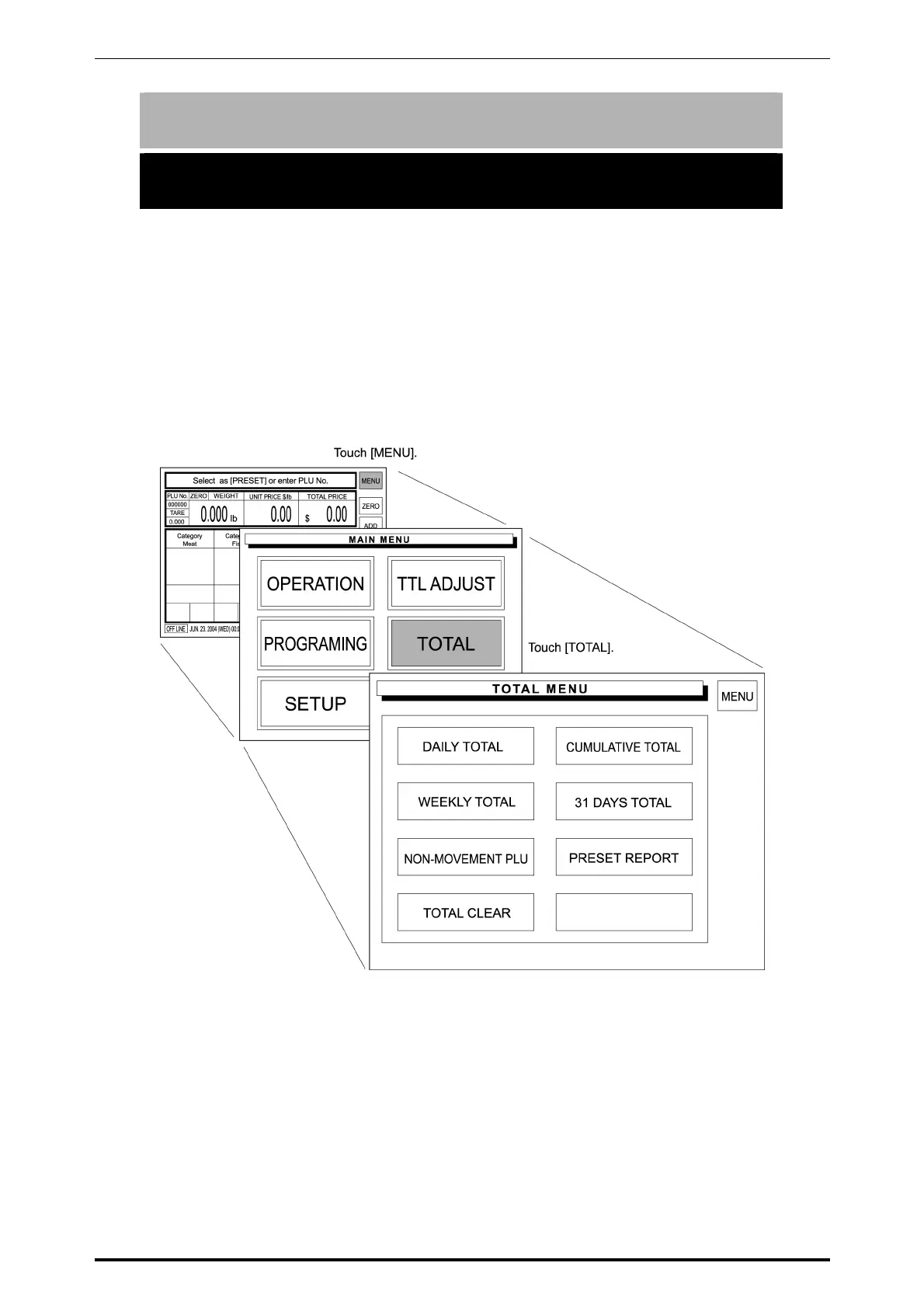 Total Mode is used to obtain various transaction totals. To enter the Total Mode from