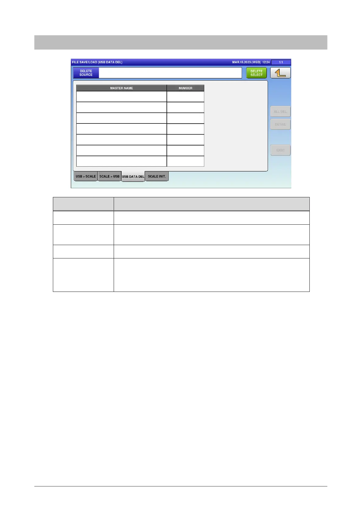 ALL SEL. Switch between “All items selected” / “All items unselected”.