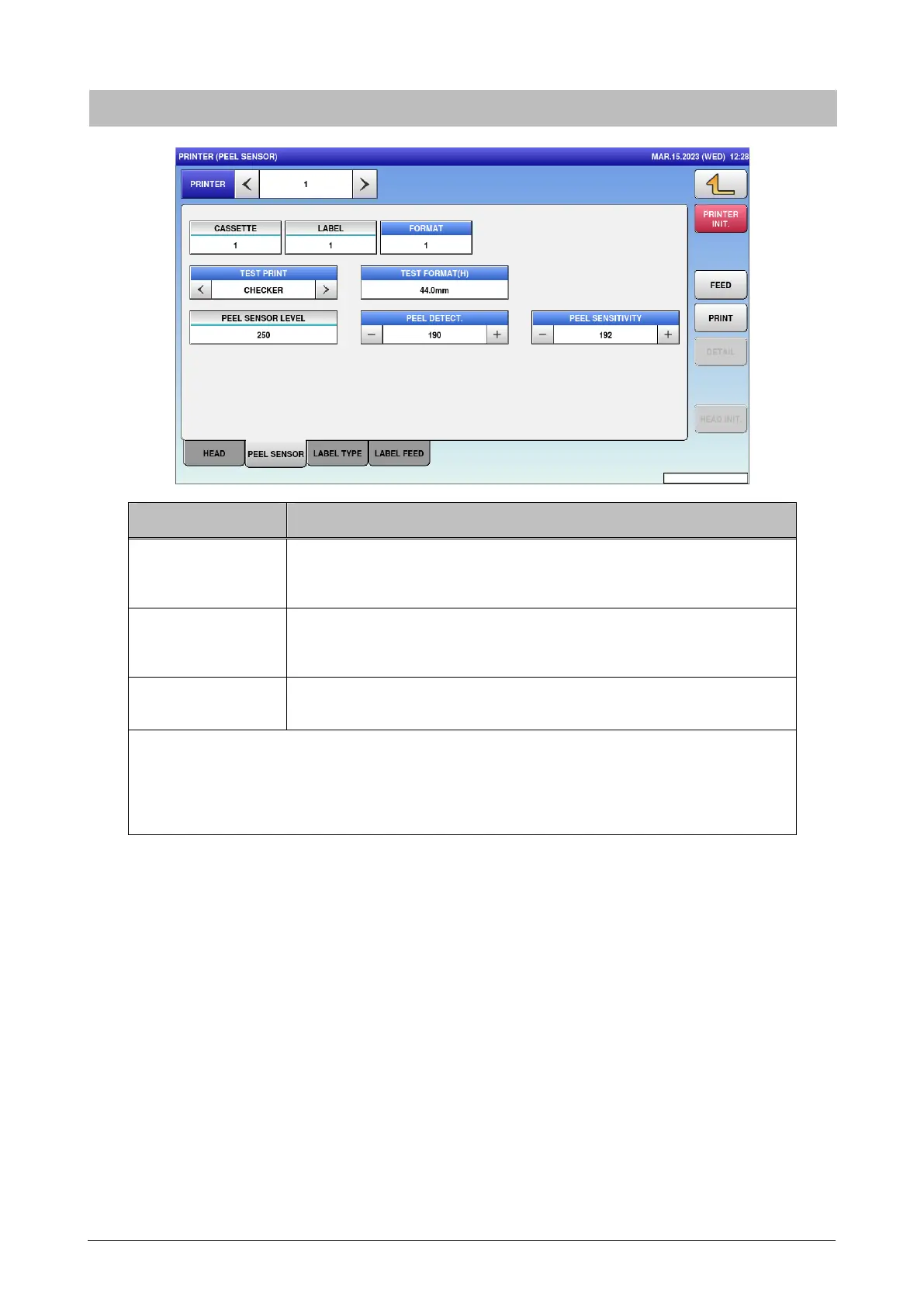 PEEL DETECT. Enter the threshold value of peel sensor.