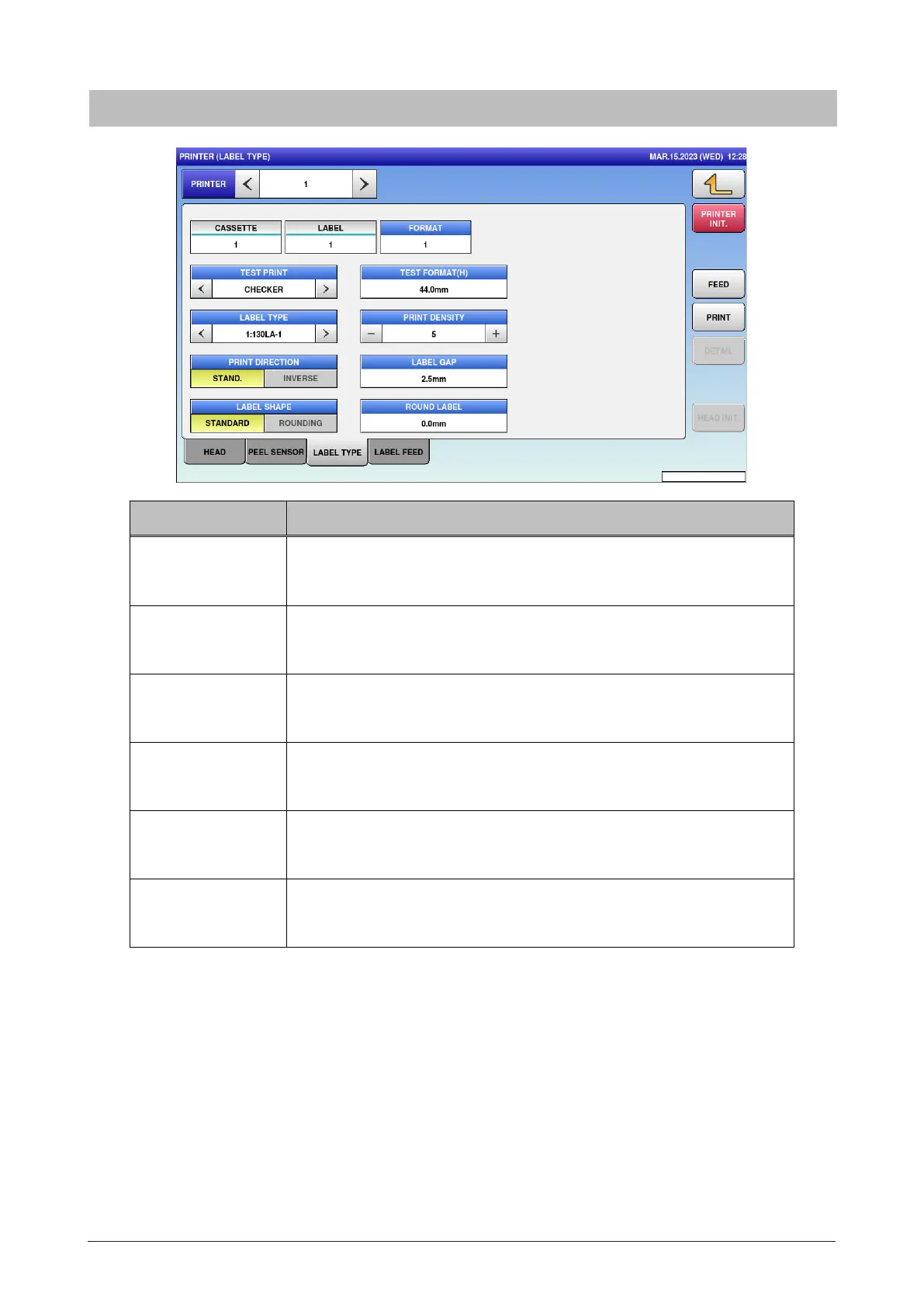 LABEL GAP Enter “Interval between labels” of the label roll set to the printer.