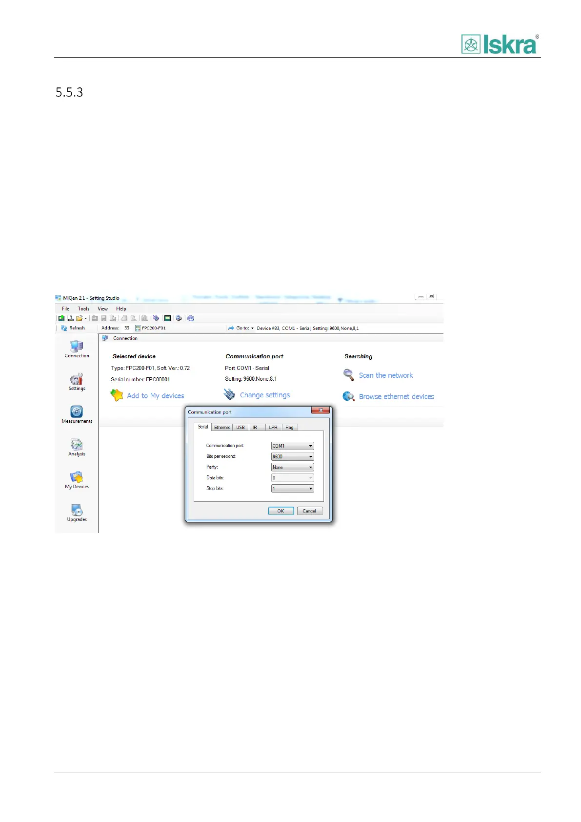 Steps to connect device to MiQen software are listed below. Figure 5.9 illustrates setting communication parameters.