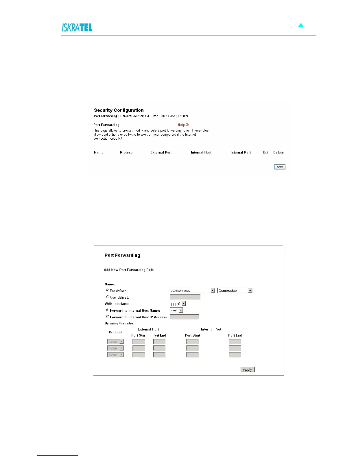 1. In the Port Forwarding page, click Add. The following page is displayed: