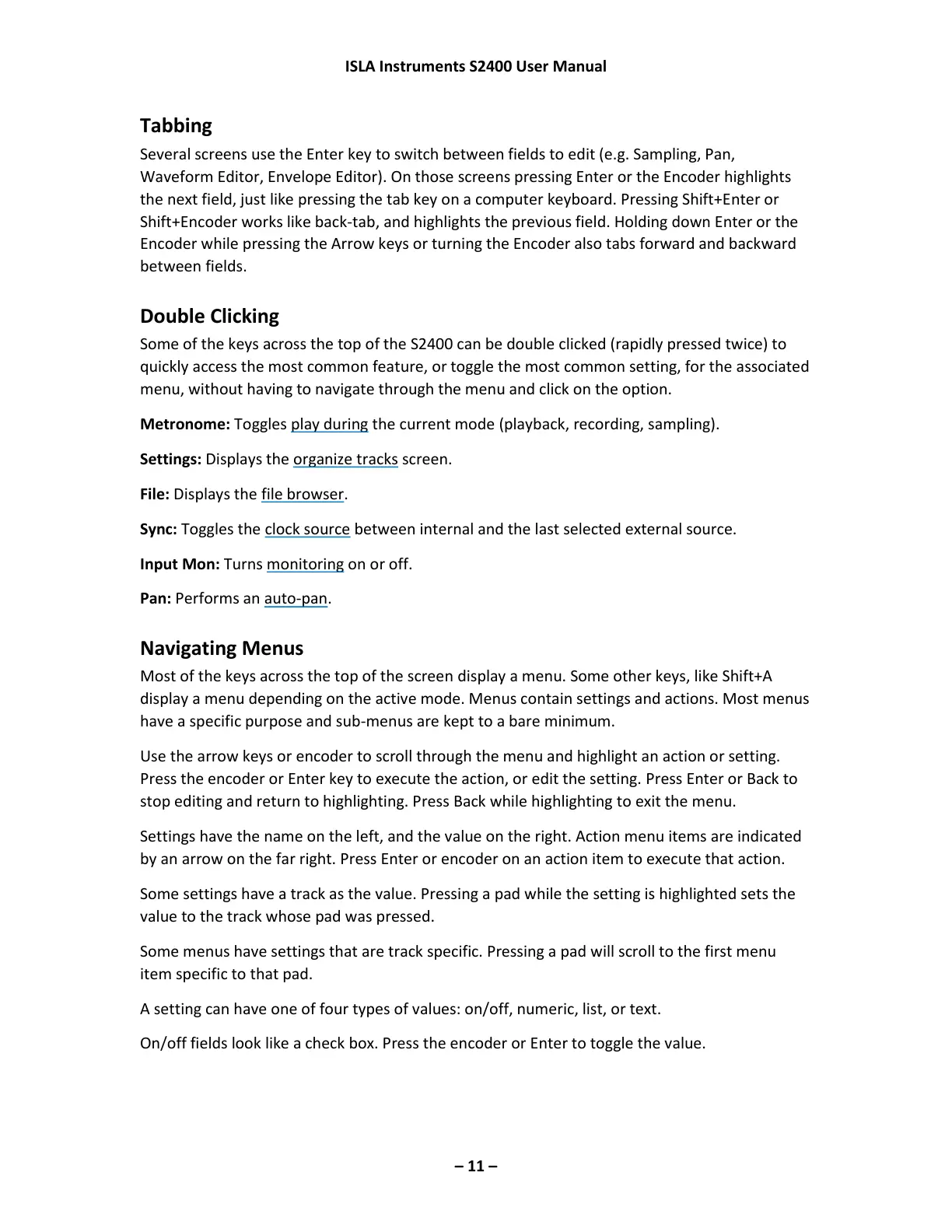Several screens use the Enter key to switch between fields to edit (e.g. Sampling, Pan,