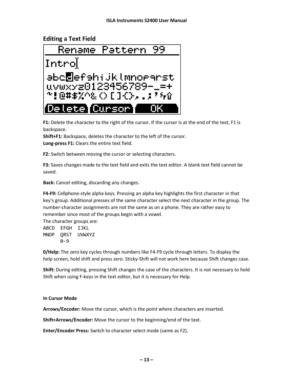 Arrows/Encoder: Move the cursor, which is the point where characters are inserted.