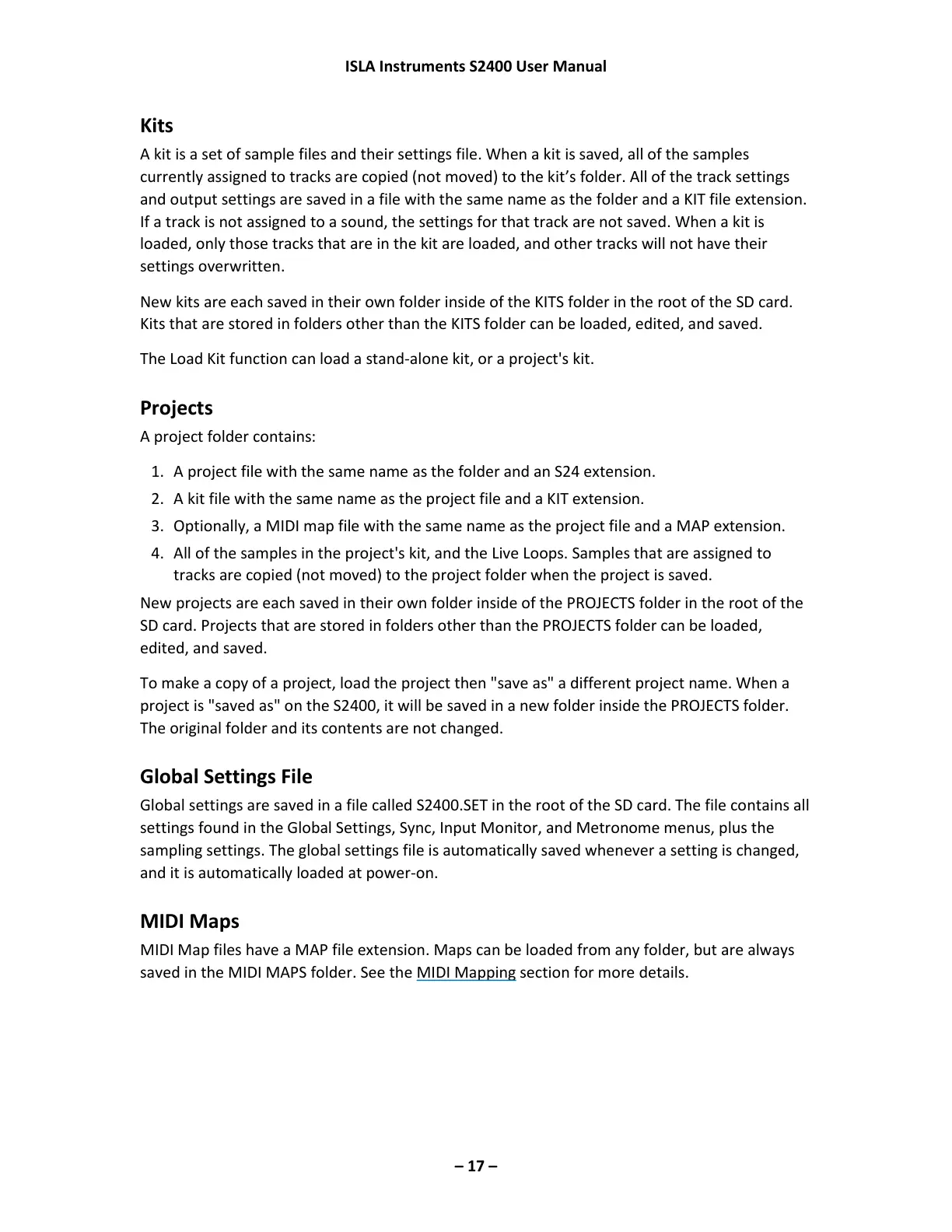 project is "saved as" on the S2400, it will be saved in a new folder inside the PROJECTS folder.