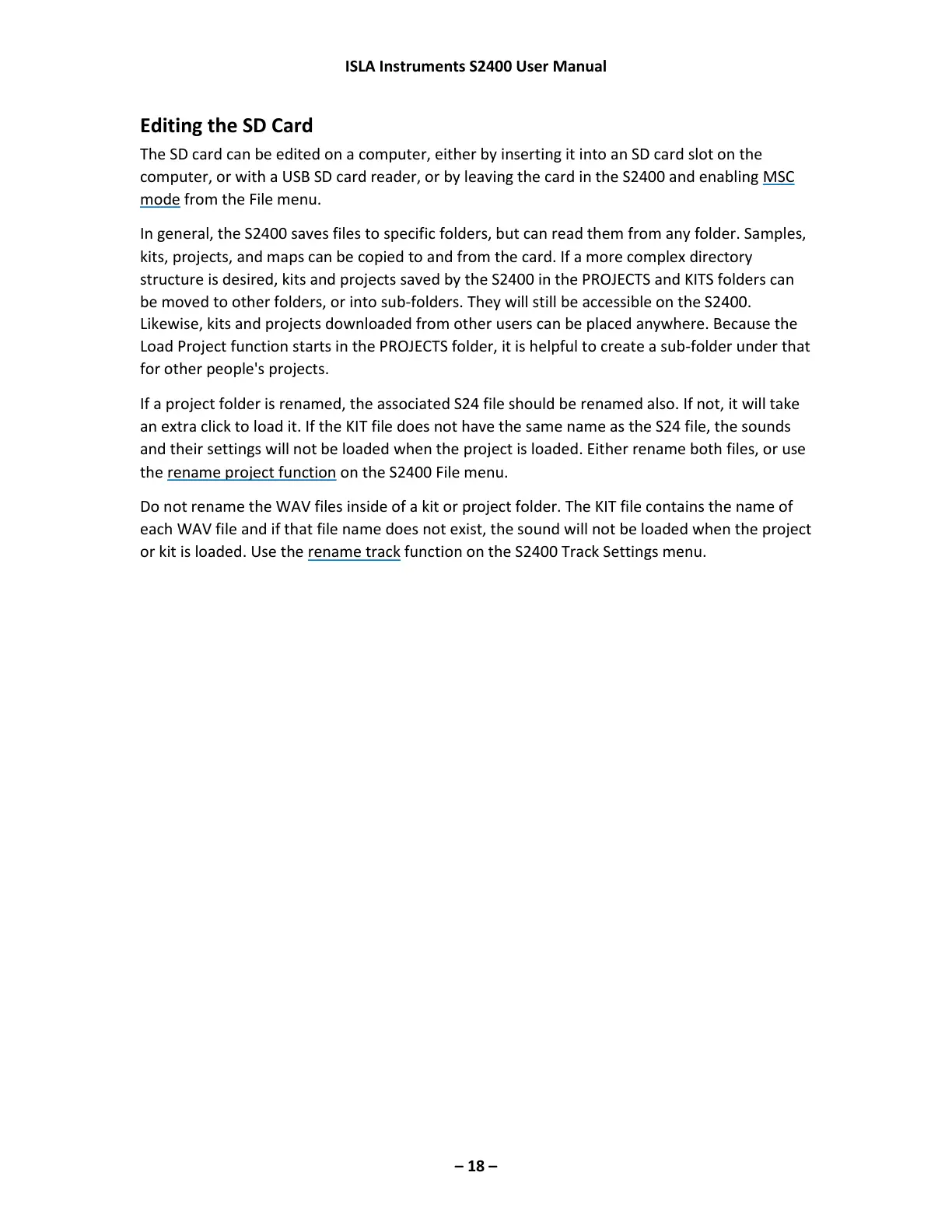structure is desired, kits and projects saved by the S2400 in the PROJECTS and KITS folders can