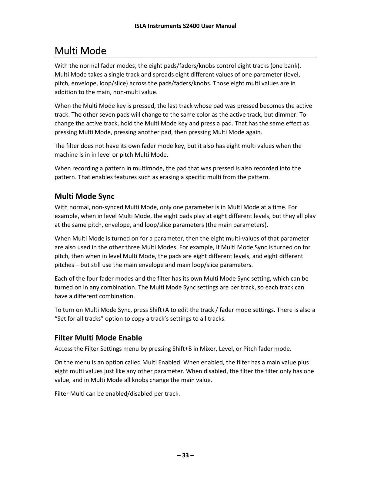 Each of the four fader modes and the filter has its own Multi Mode Sync setting, which can be