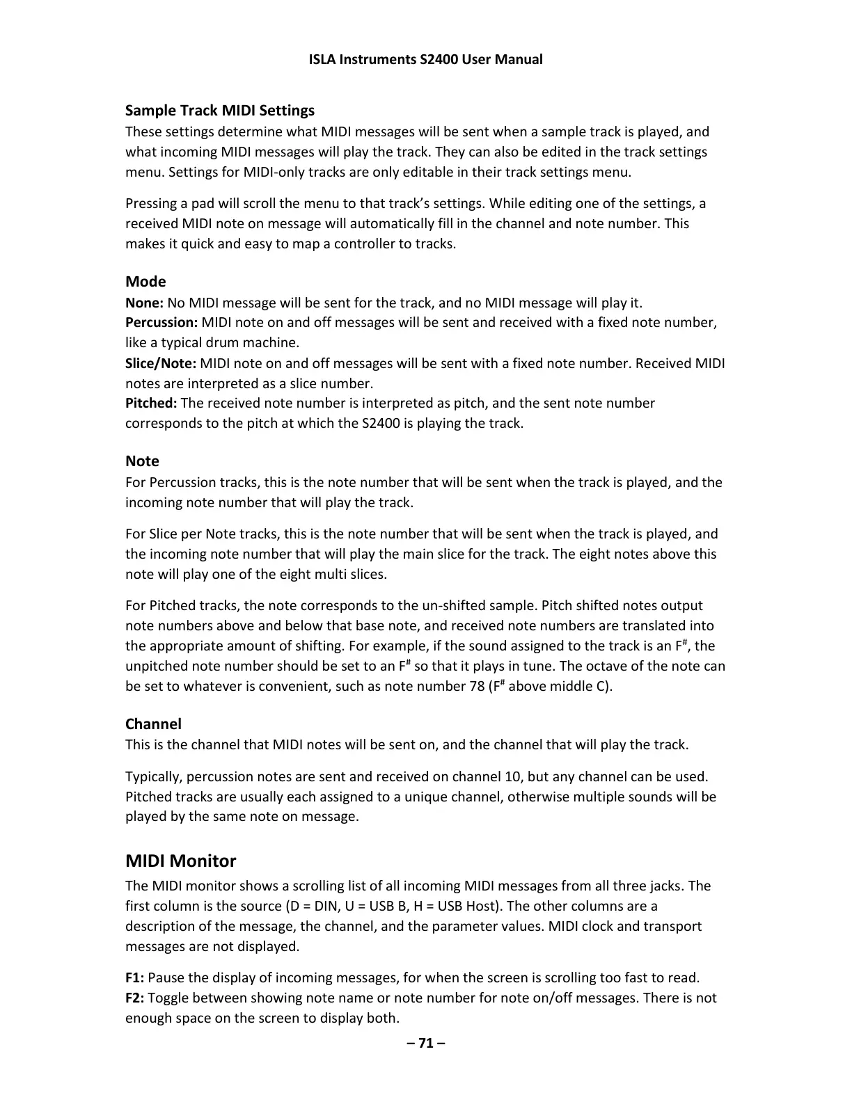 F2: Toggle between showing note name or note number for note on/off messages. There is not