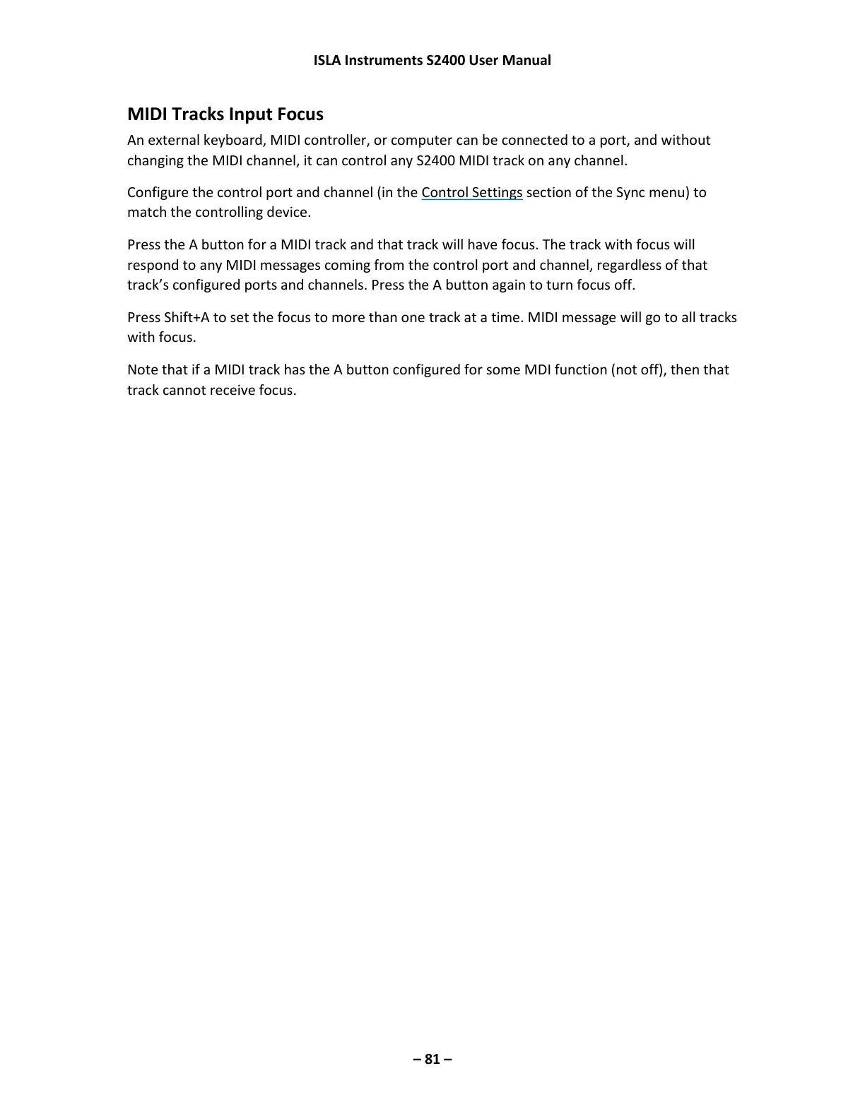 changing the MIDI channel, it can control any S2400 MIDI track on any channel.