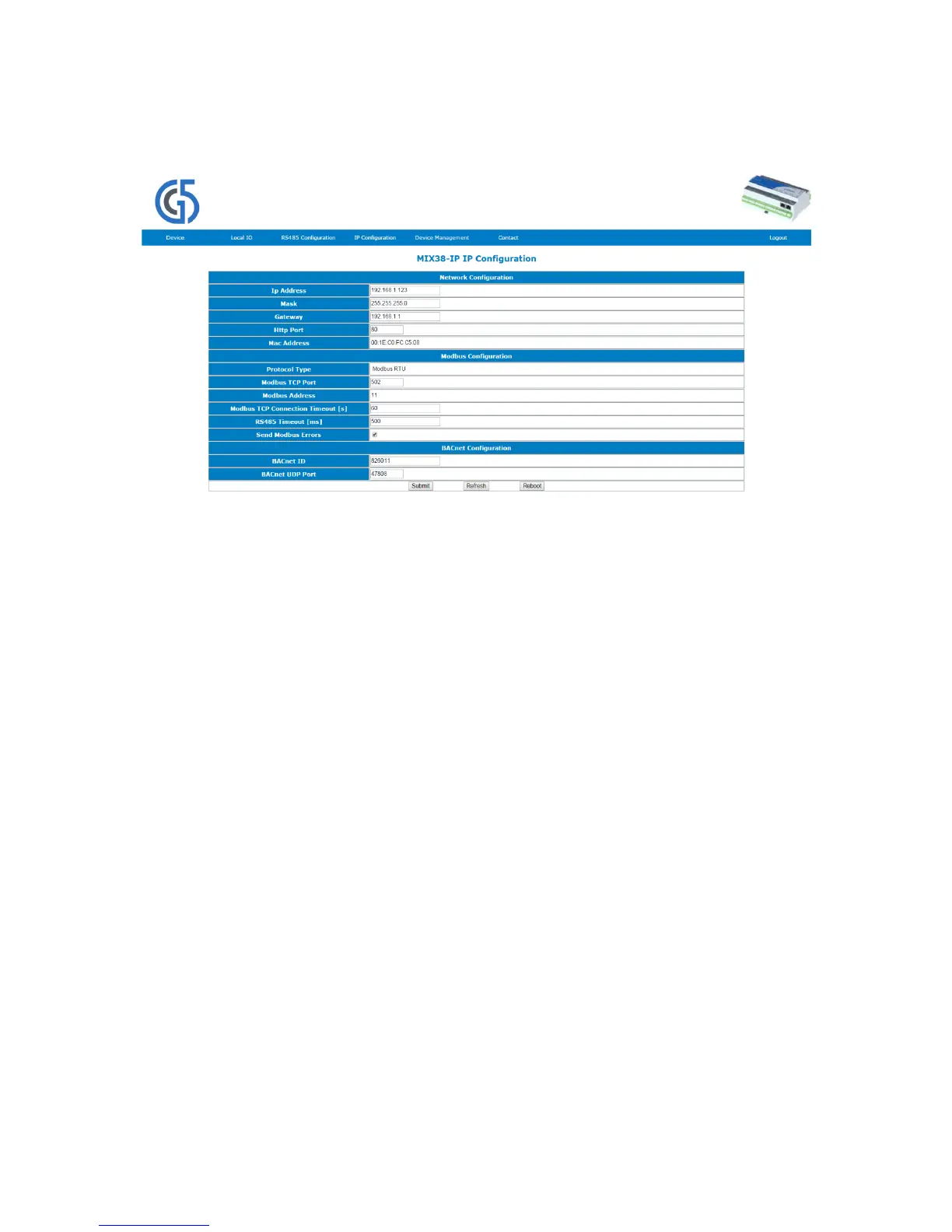 This page allows to change parameters of Ethernet port, Modbus TCP and BACnet IP.