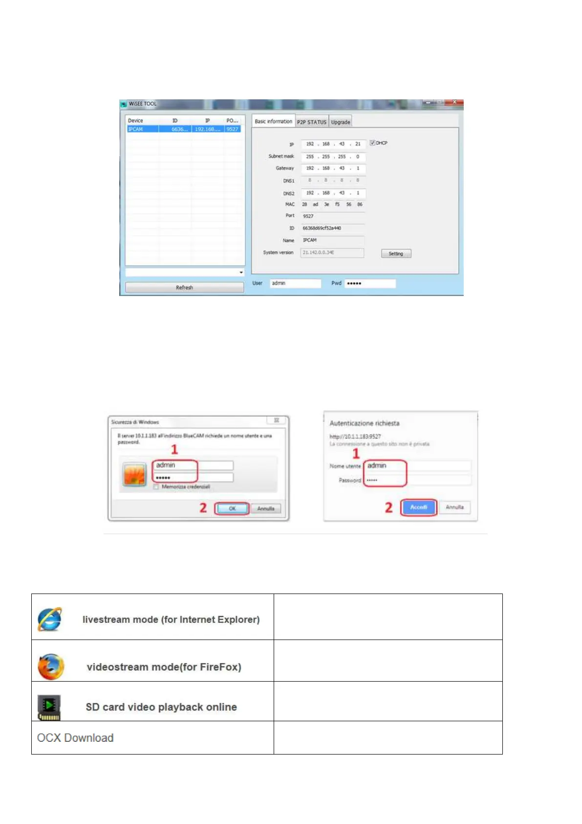 Browser, in rete locale. Nell’esempio, l’IP della camera è 192.168.43.21 e la porta web è la 9527. Avviare il browser